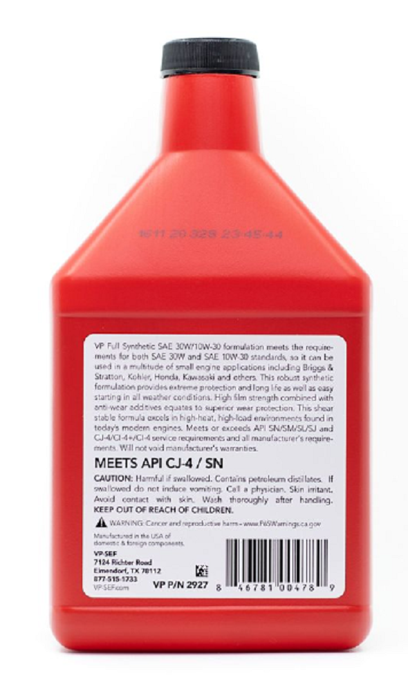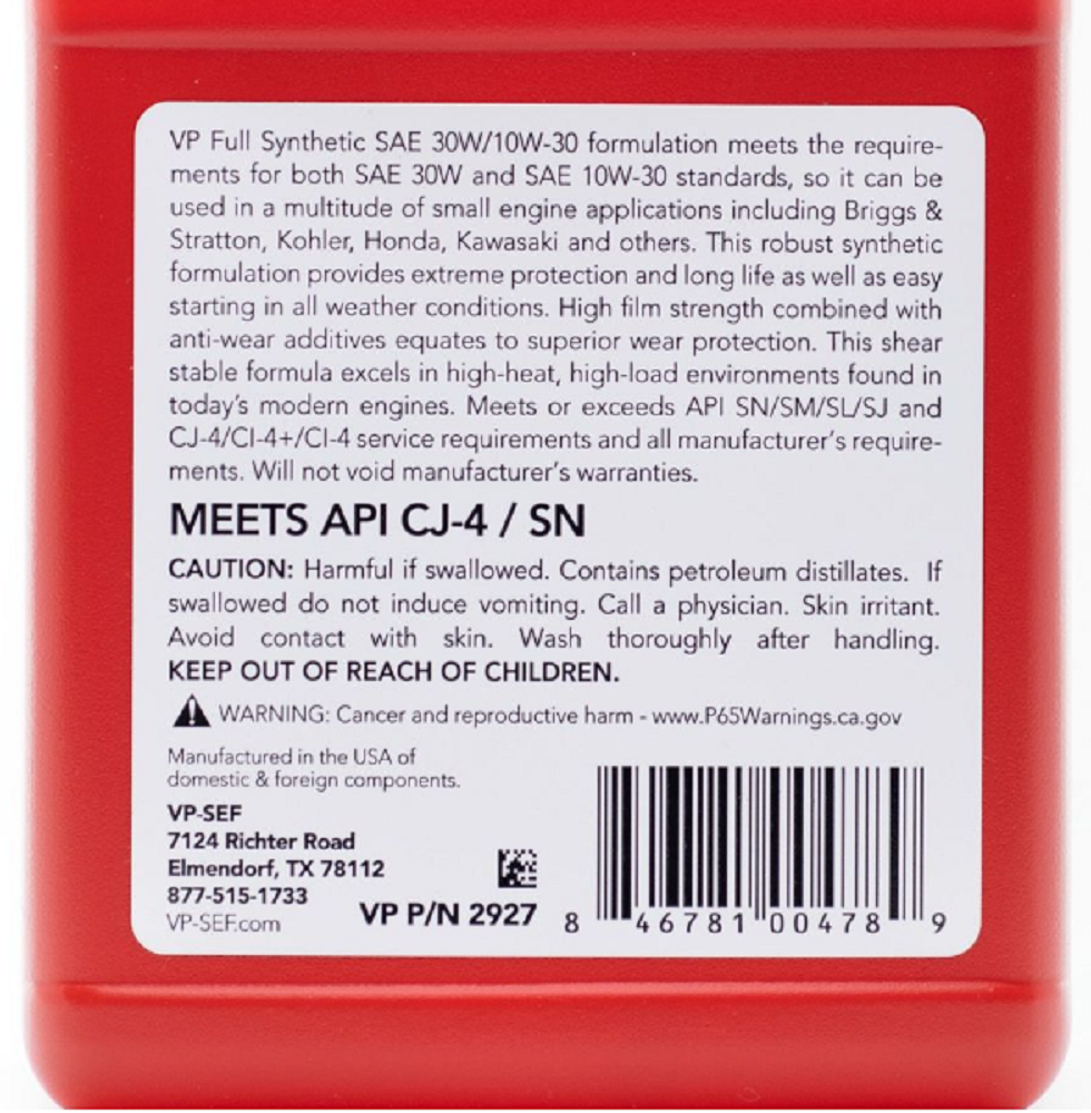 VP Small Engine 2927 Fuels Full Synthetic SAE 30 10W 30 Motor Oil, 18 oz.