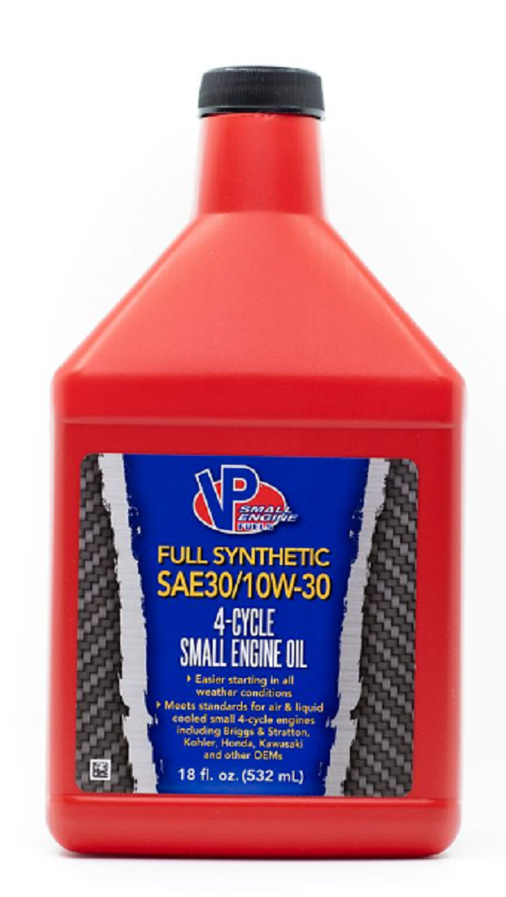 This VP Small Engine Fuels Fully Synthetic SAE 30 10W 30 Motor Oil was designed for ALL 4-cycle outdoor power equipment engines - air-cooled, liquid-cooled, or diesel. Its dual grade viscosity spec means that it meets the standards for both 10W-30 and SAE 30 oil. This SAE 30 motor oil is inherently biodegradable. It meets the viscosity specs for Kawasaki, Honda, Kohler, Briggs and Stratton SAE 30 oil, and more.