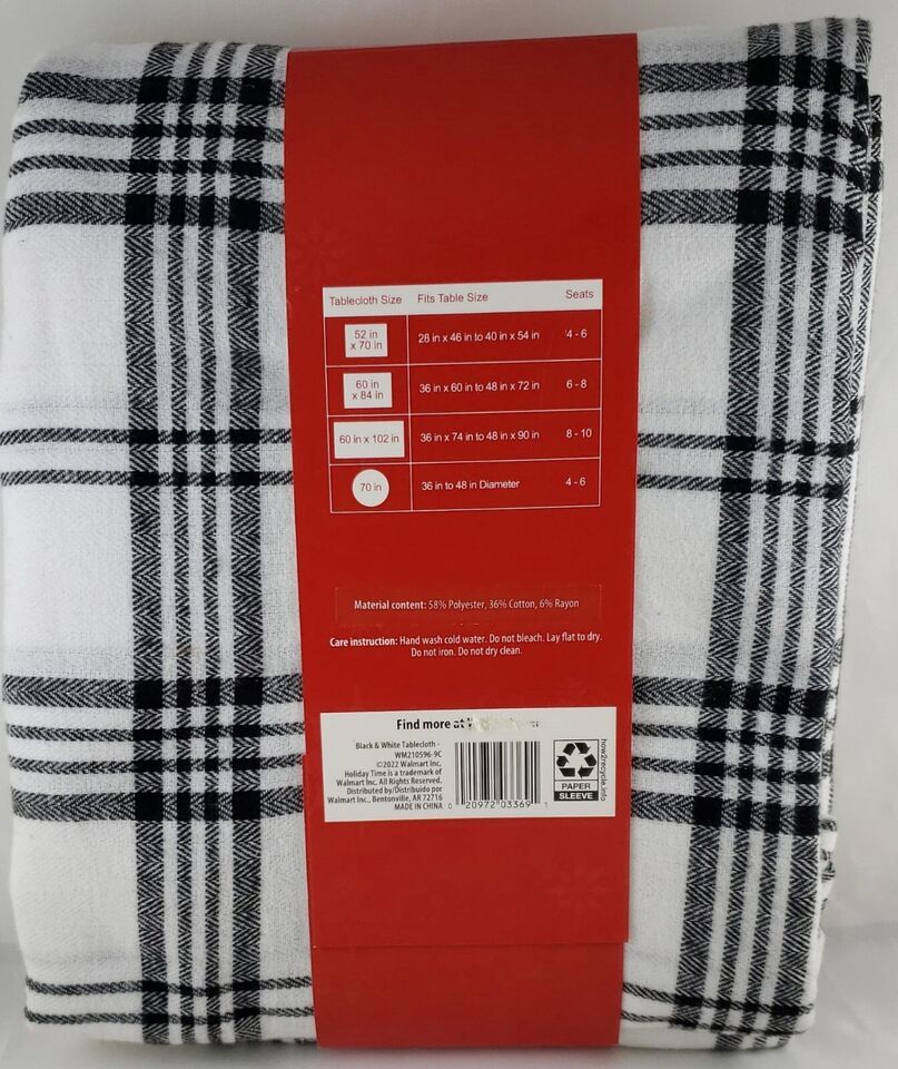 Add a touch of holiday cheer to your dining table with this black and white plaid fabric tablecloth from Holiday Time.