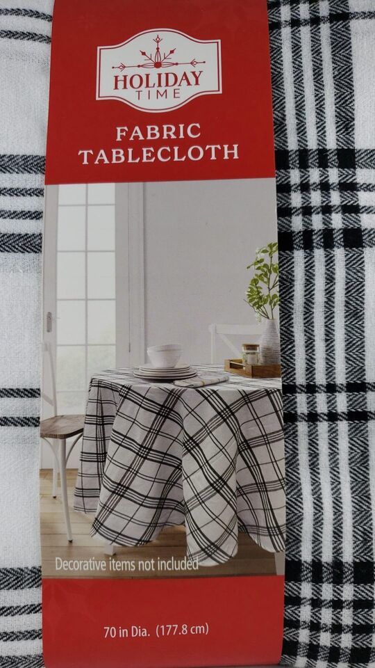 Fabric Tablecloth Holiday Time Black and White Plaid 70" Round