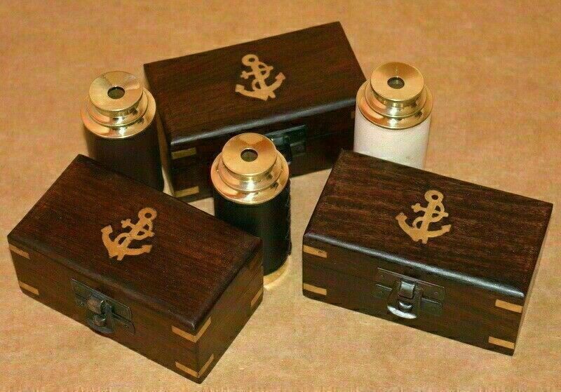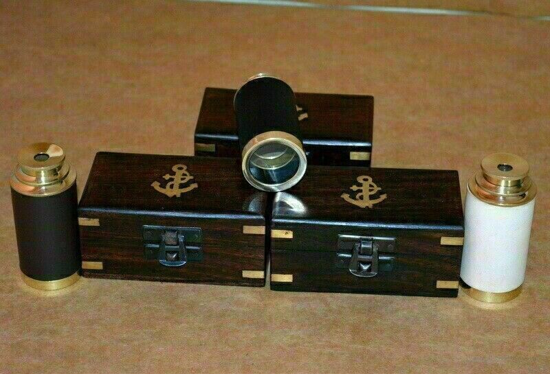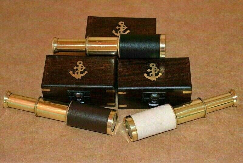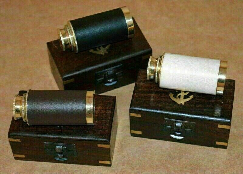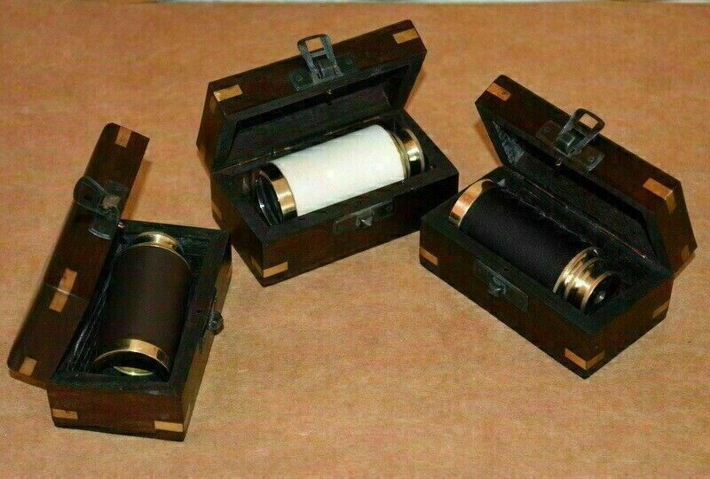 6" Brass telescope nautical spyglass brown,black,white leather with wooden box
