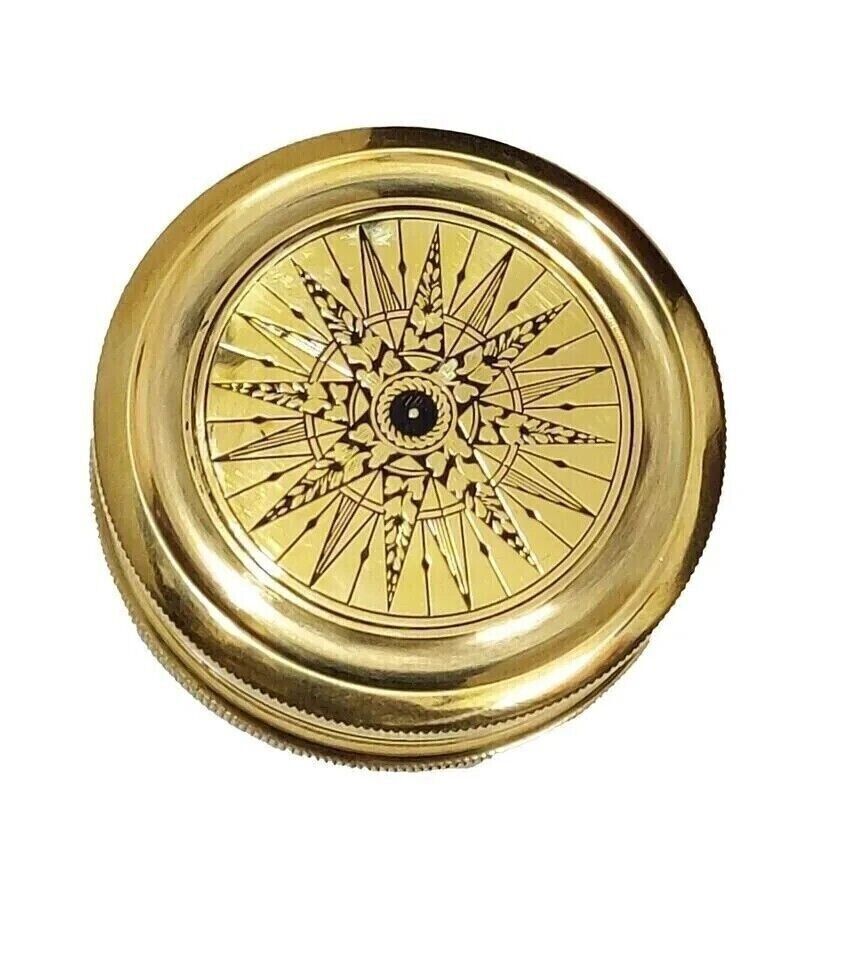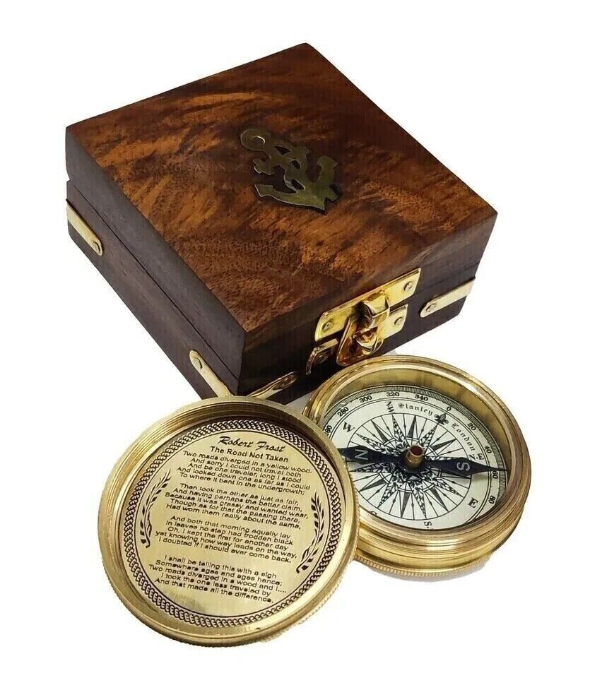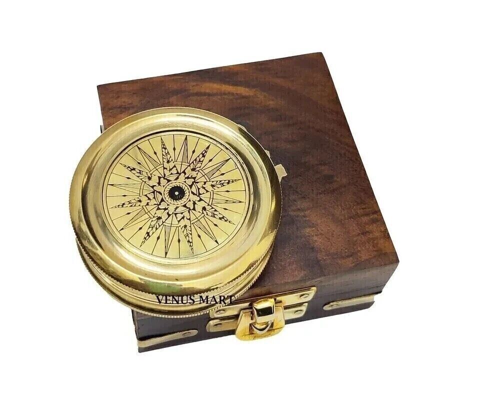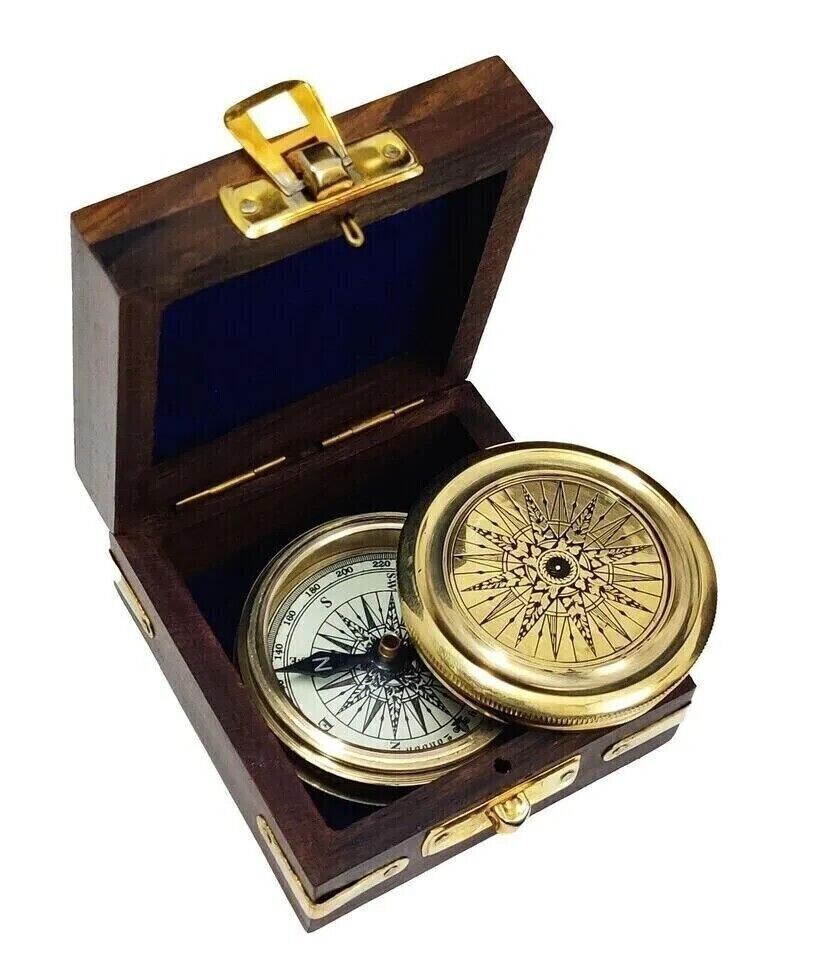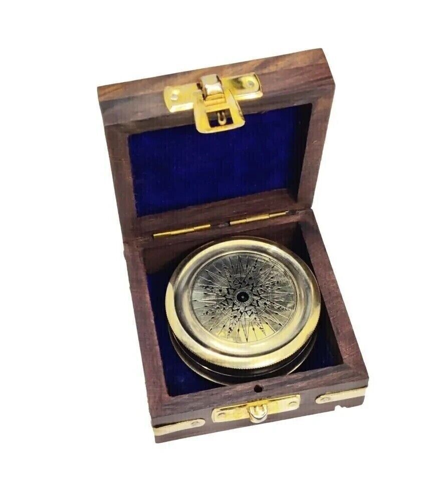 Antique Brass Compass with Wooden Box Nautical Vintage Collectible & Gift