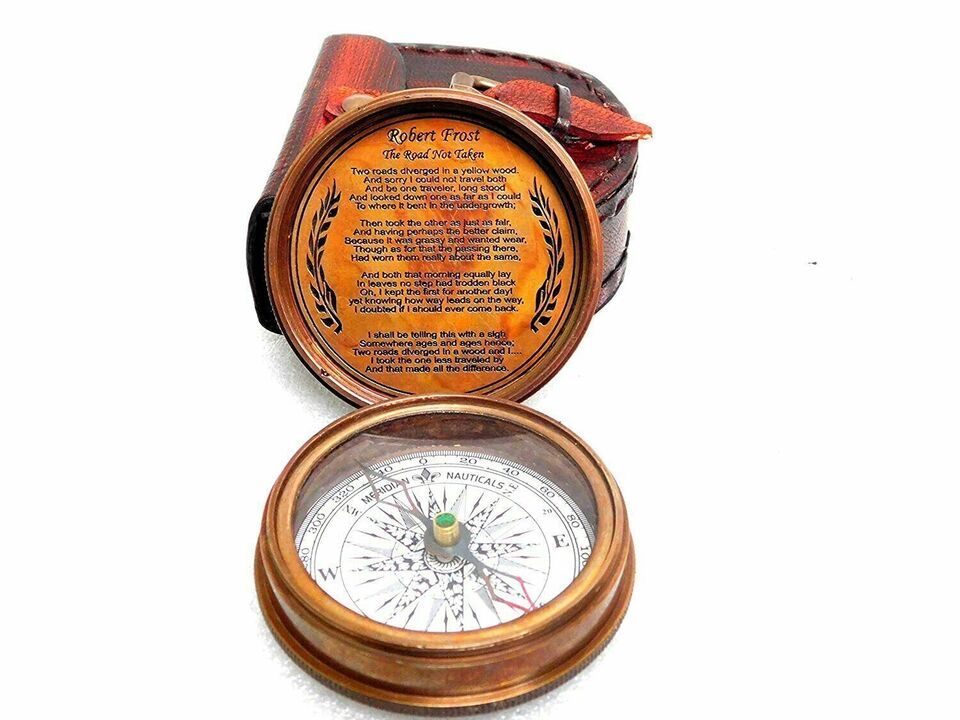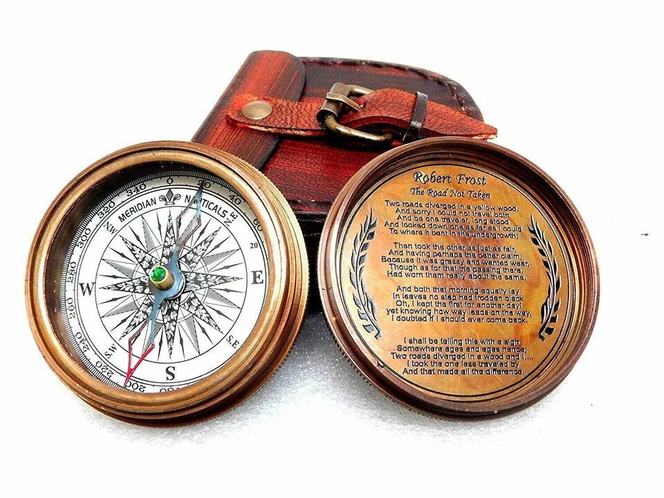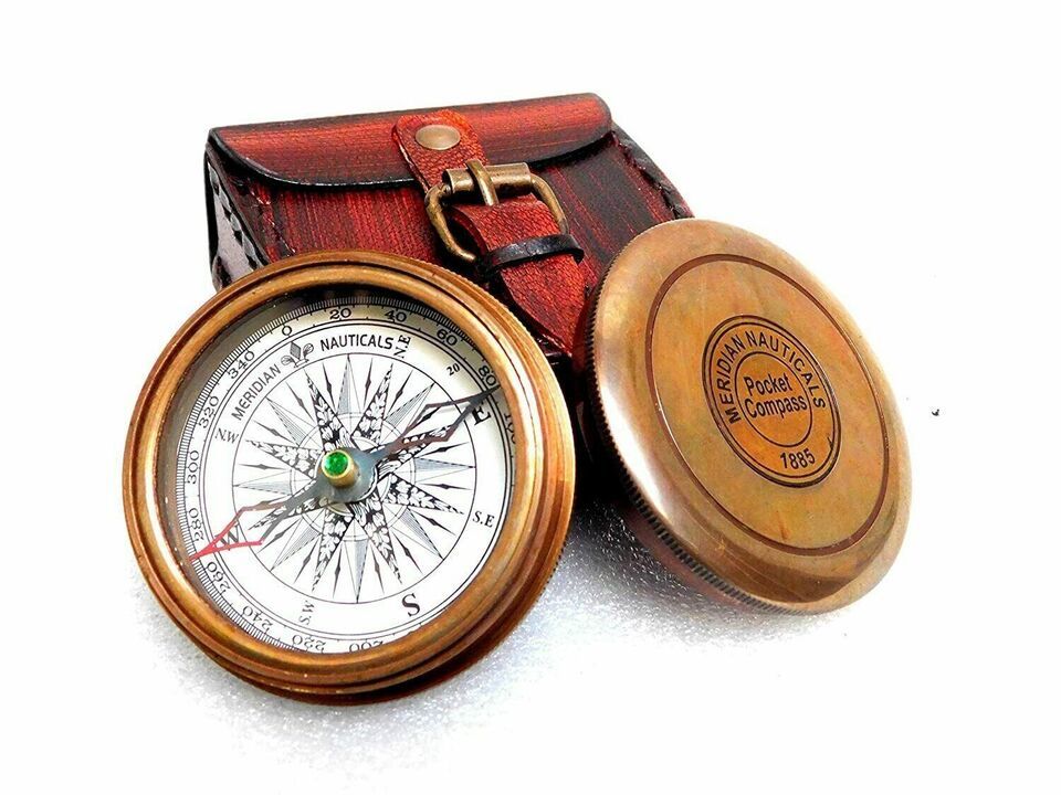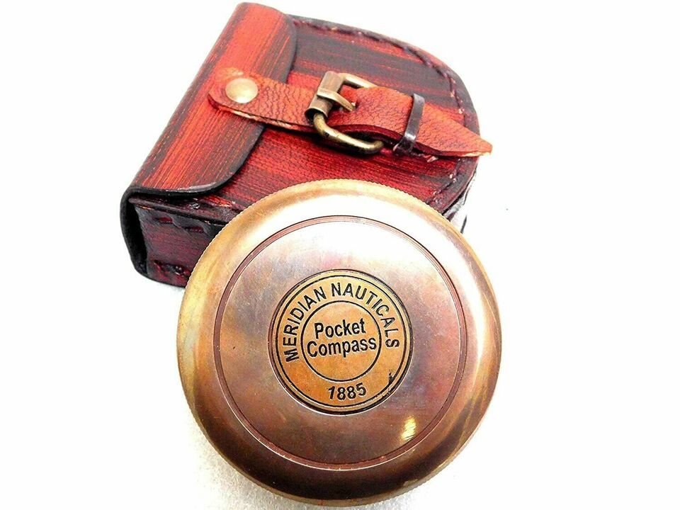 Antique Meridian Nautical Pocket Brass Poem Compass with Beautiful Leather Case