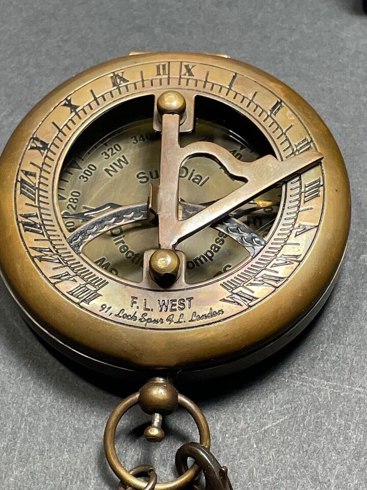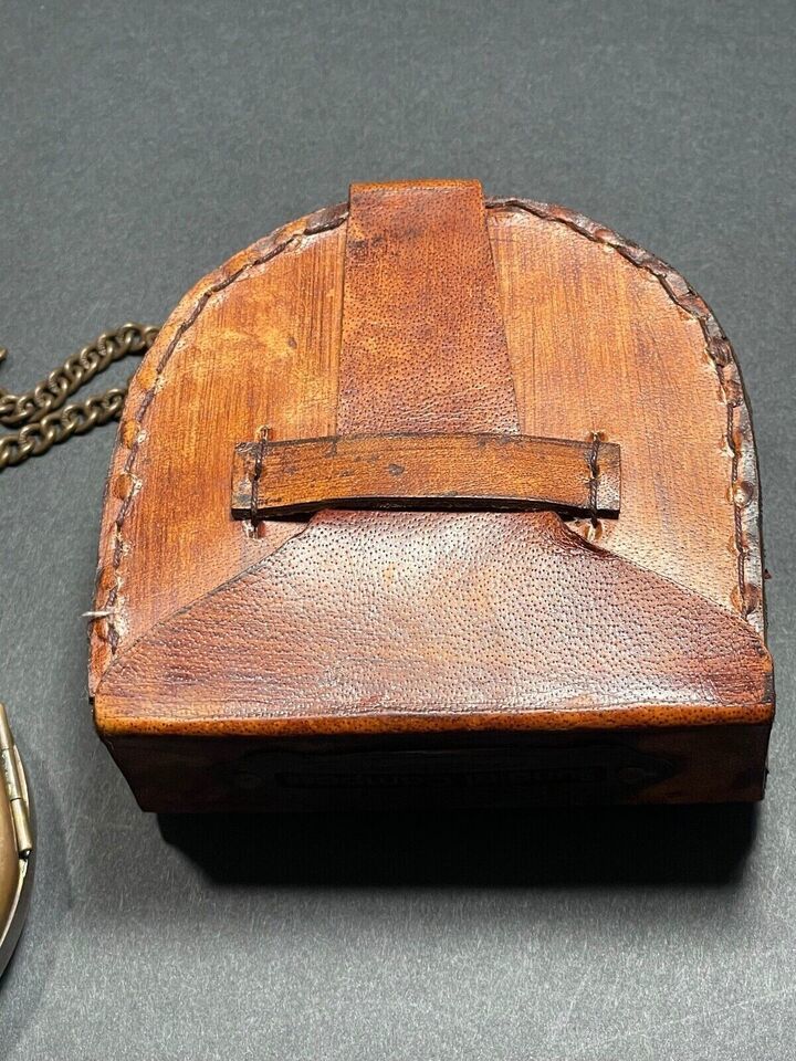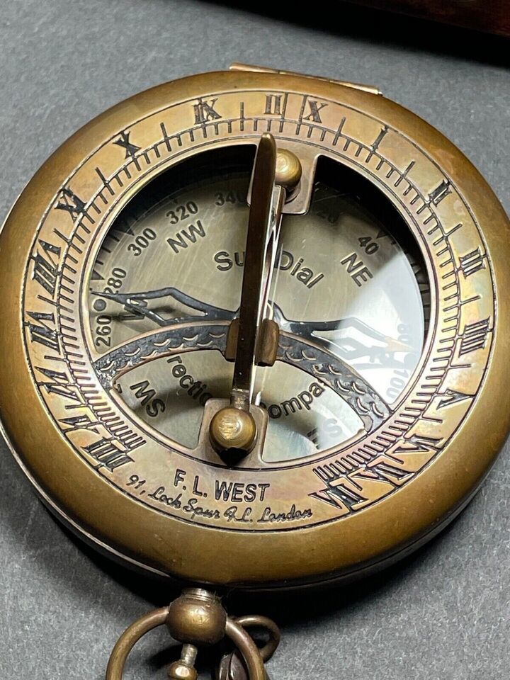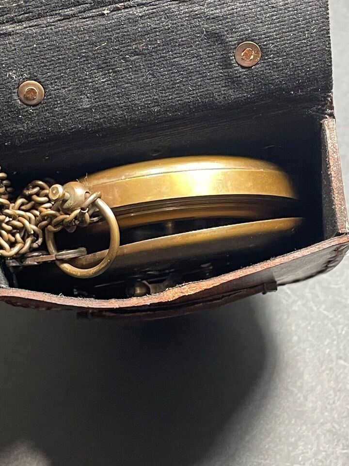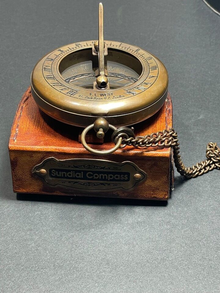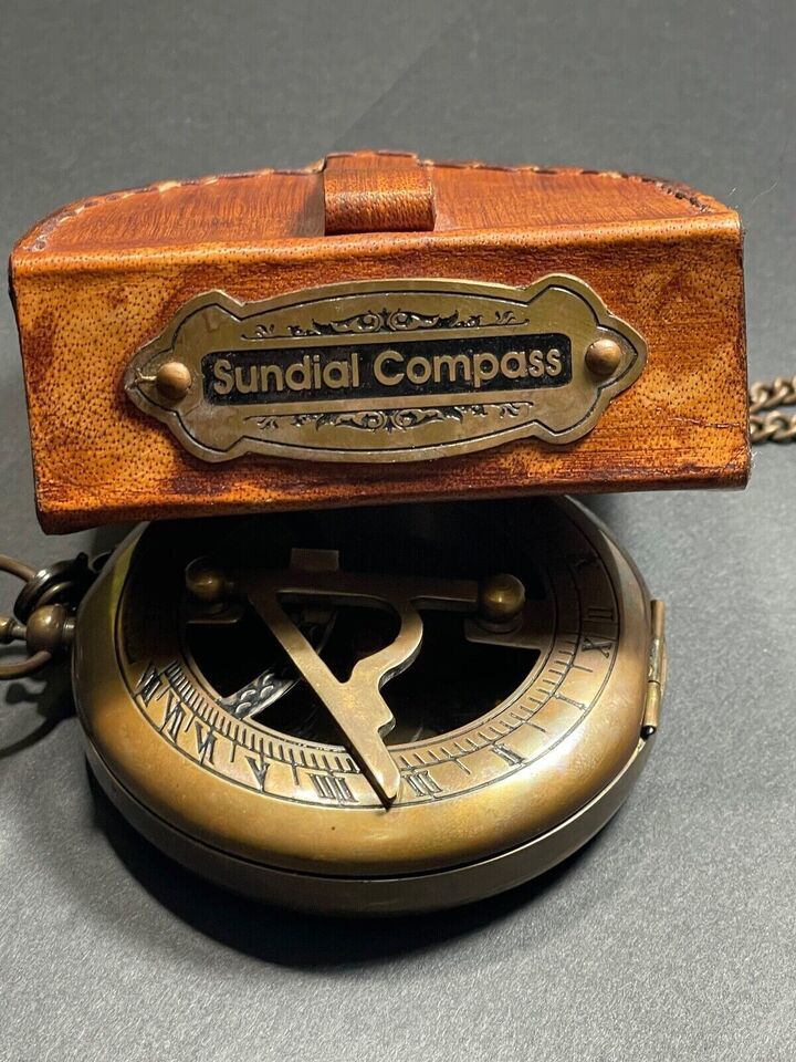 Vintage Nautical Push Button Sundial Antique Brass Compass With Leather Case