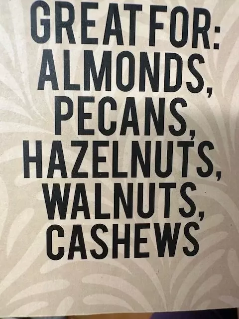 Great for Almonds, Pecans, Hazelnuts, Walnuts, Cashews and Peanuts.