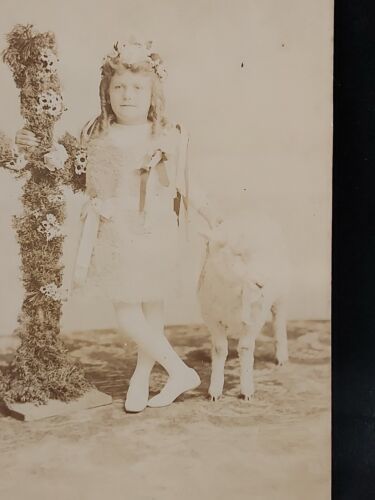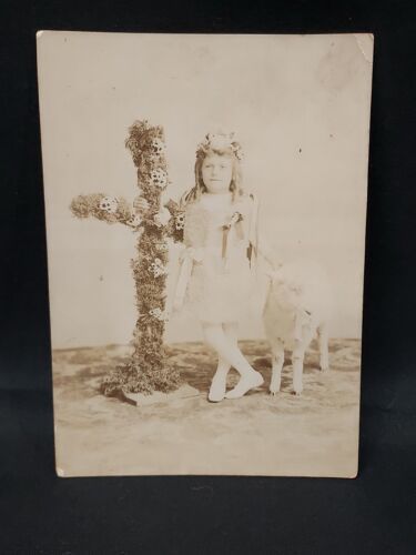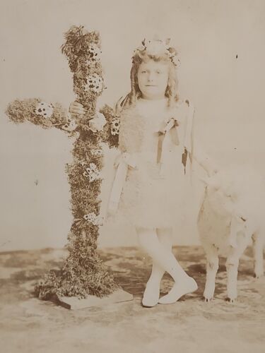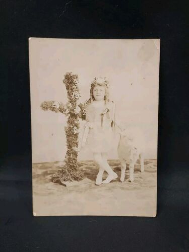 Early 1900s Religious Photo Girl With Large Cross And Goat Rare Original . Condition is Used. Shipped with USPS Ground Advantage.