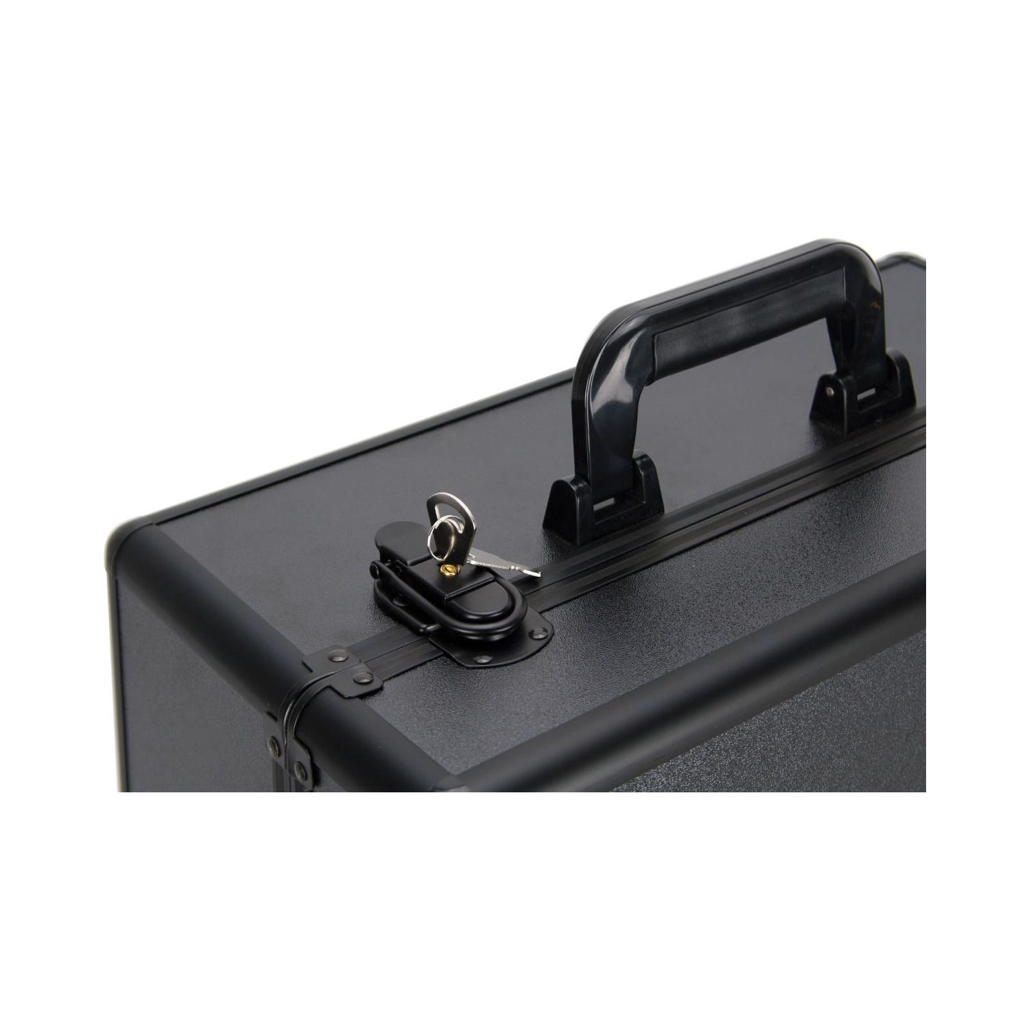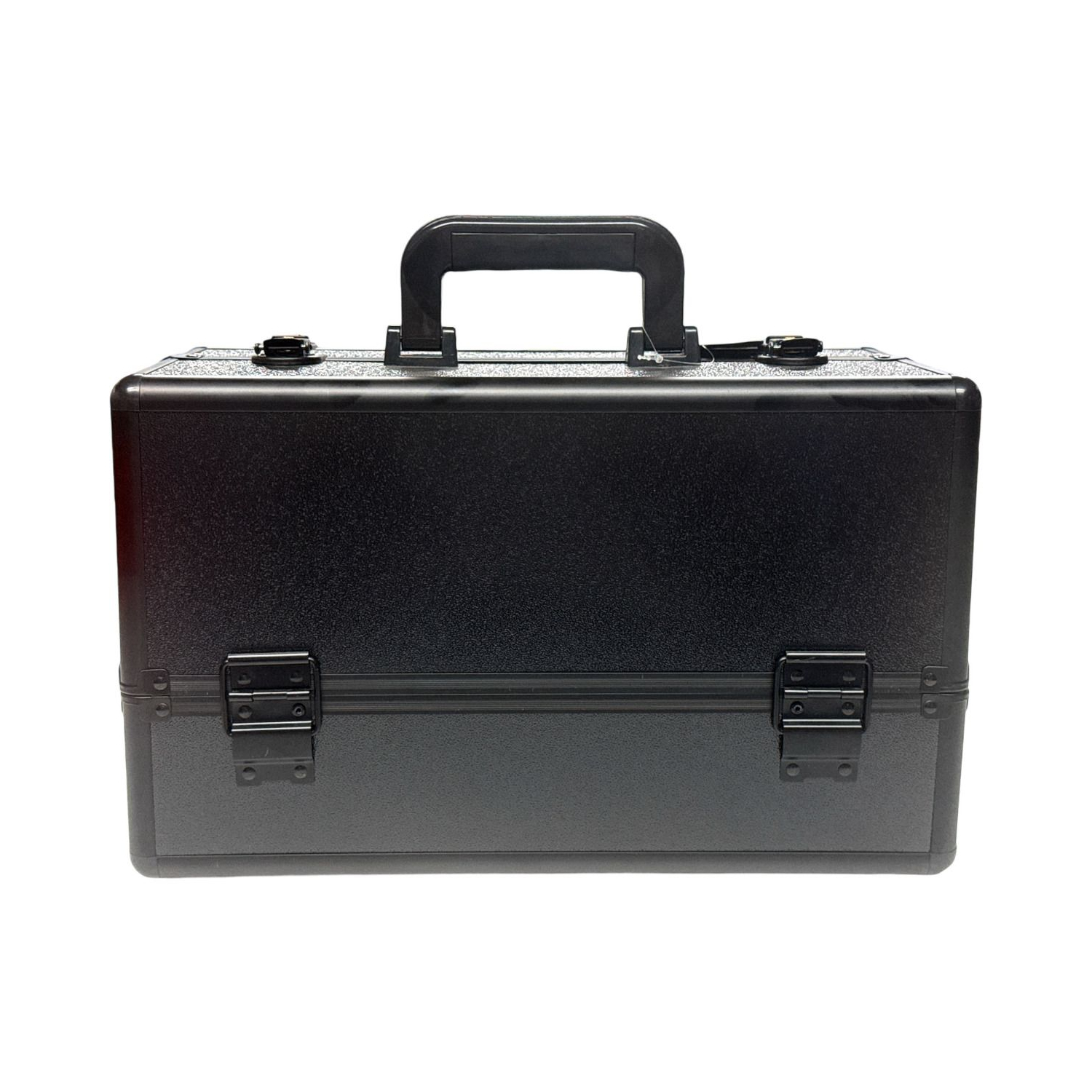 High quality aluminum finish and construction with reinforced steel corners for extra durability Beautiful black matte finish with black aluminum trimming Six extendable easy-slide accordion trays with spacious interior Spacious lower compartment Heat resistant exterior material keeps the case cool and protects your cosmetics Removable and adjustable shoulder strap Swivel handle top Easy to clean interior Two brush holder cup Two secure easy close latches with key locks Trays dimension: 5.75" x 5.25" x 1.25" Space underneath trays when closed: 14.25" x 6.5" x 3.5" Overall case dimension: 15" x 7.5" x 9"