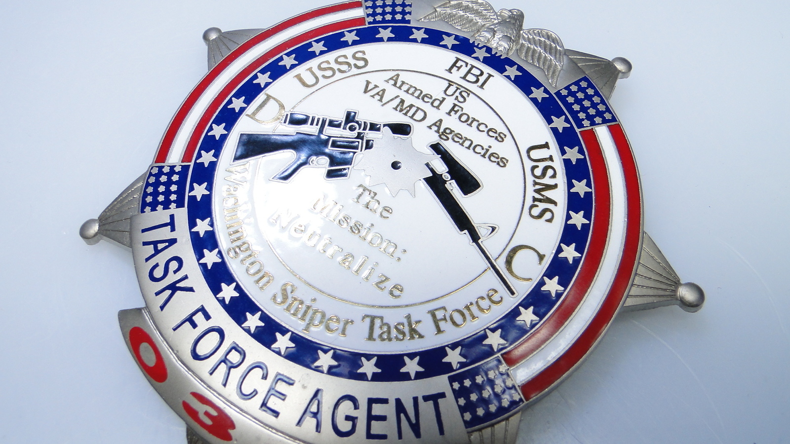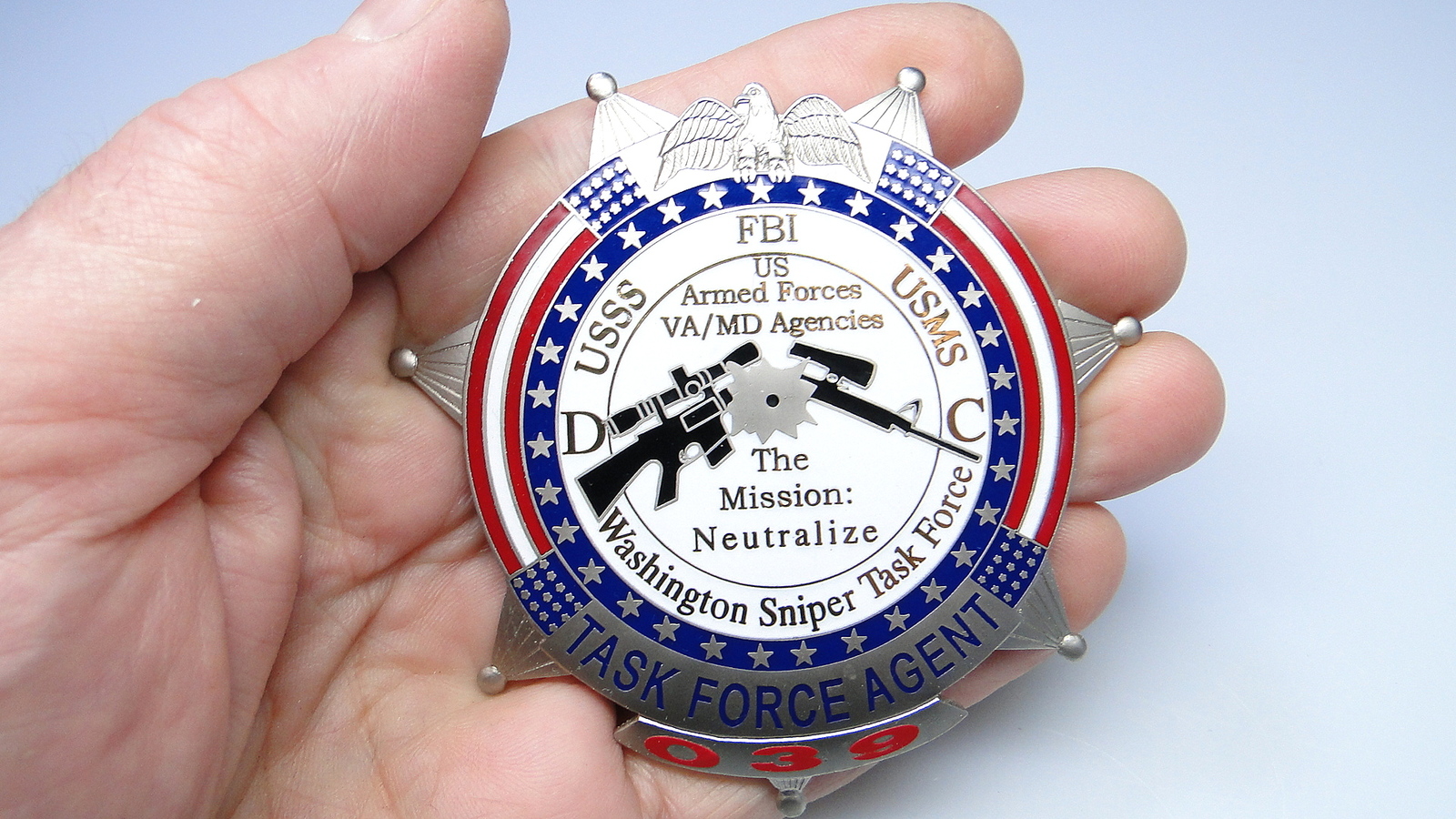 Please check my seller's list for more badges from the same estate collection. This particular listing is for a silver tone colorful enameled badge clip marked FBI USSS USMS Armed Forces VA/MD Agencies Washington Sniper Task Force Agent with a number. It measures approx 3" and has a clip on back-NOT a pin like a typical badge-and is marked Allbadges.com 2002. You're getting it just as I did, good condition, normal wear, sold as found. Please email with questions or concerns prior to purchase. Shipping is $8.00. Final sale, no returns or refunds. I'd be glad to combine shipping on multiple purchases whenever possible.