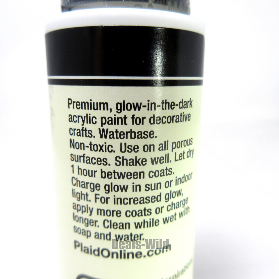 Premium, glow-in-the-dark acrylic paint for decorative crafts. Waterbase. Non-toxic. Use on all porous surfaces. Charge glow in sun or indoor light. For increased glow, apply more coats or charge longer.