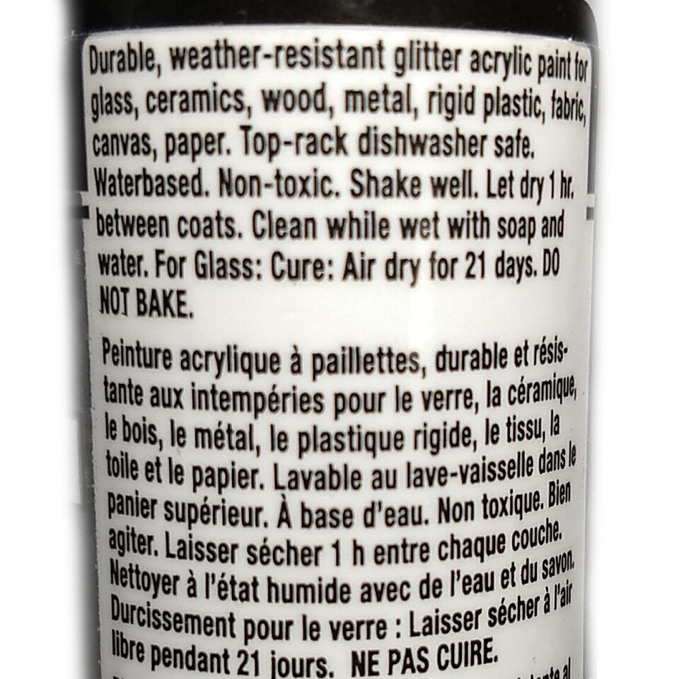 Waterbased. Weather-resistant. Non-toxic. Multi-surface glitter acrylic paint.