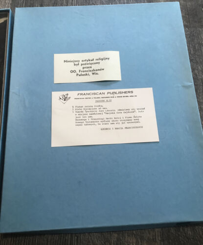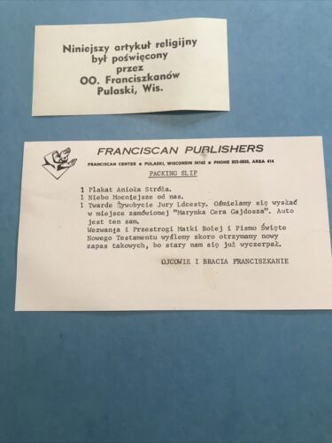 This religious article was dedicated by 00. Franciscans Pulaski, Wis. FRANCISCAN PUBLISHERS FRANCISCAN CENTER PULASKI, WISCONSIN 54162 PHONE 822-5833, AREA 414 PACKING SLIP 1 Guardian Angel poster. 1 Heaven Stronger than us. 1 Hard Living Jury Ldcesty. We dare to send in place of the ordered "Marynka Cera Gajdosza". The car is the same. Our Lady's invitations and warnings and the Holy Scriptures of the New Testament will be sent as soon as we receive a new supply of them, because the old one has already run out. FRANCIS FATHERS AND BROTHERS