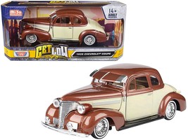 Brand new 1/24 scale diecast car model of 1939 Chevrolet Coupe Lowrider Beige and Brown Metallic "Get Low" Series die cast model car by Motormax. Brand new box. Real rubber tires. True-to-scale detail. Officially licensed product. Has opening hood, doors and trunk. Manufacturer's original unopened packaging. Made of diecast metal with some plastic parts. Detailed interior, exterior, engine compartment. Dimensions approximately L-7.5, W-3, H-2.75 inches. Please note that manufacturer may change packing box at any time. Product will stay exactly the same.