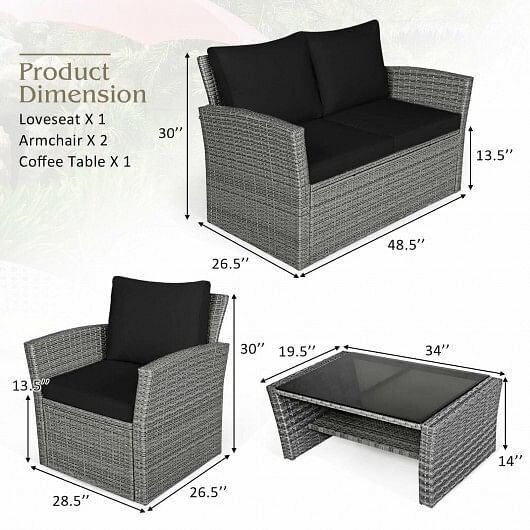 Specifications: Color of cushions: Gray/Red/Turquoise/Khaki/Black Color of rattan: Mix gray Material: Rattan steel sponge polyester cloth Dimensions of loveseat: 48.5" x 26.5" x 30" (L x W x H) Dimensions of armchair: 28.5" x 26.5" x 30" (L x W x H) Dimensions of coffee table: 34" x 19.5" x 14" (L x W x H) Dimensions of seat cushion: 22.5" x 20.5" (L x W) Dimensions of back cushion: 21" x 17" (L x W) Seat cushion thickness: 3" Net weight: 89 lbs Weight capacity of loveseat: 800 lbs Weight capacity of each armchair: 400 lbs Box QTY: 2(May vary by batch)Package includes? 2 x Armchair 1 x Loveseat 1 x Coffee table 4 x Seat cushions 4 x Back cushions 1 x Instruction