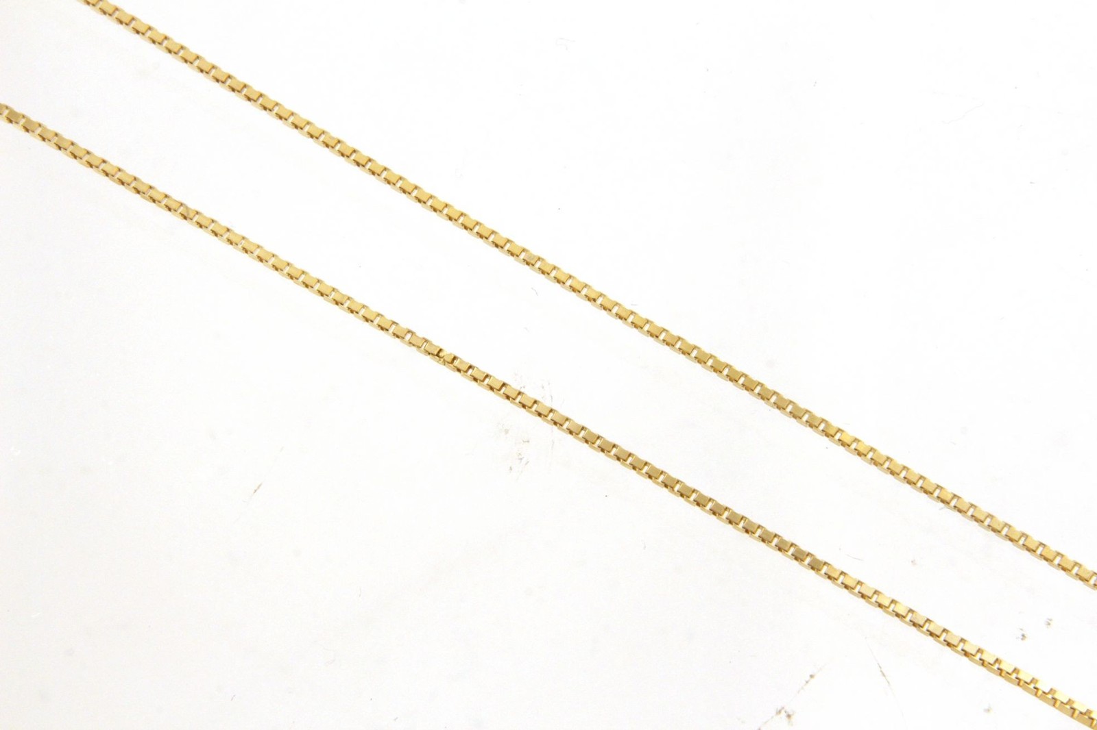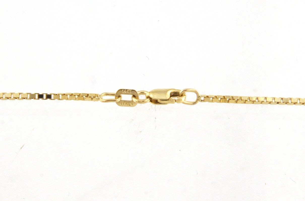 Type: ChainWeight: 2.8Karat: 14ktMetal: Yellow GoldGender: UnisexStyle: Box LinkSize / Length: 20"Owner applied: 585 14kt italyWidth: 1mmCondition:Used