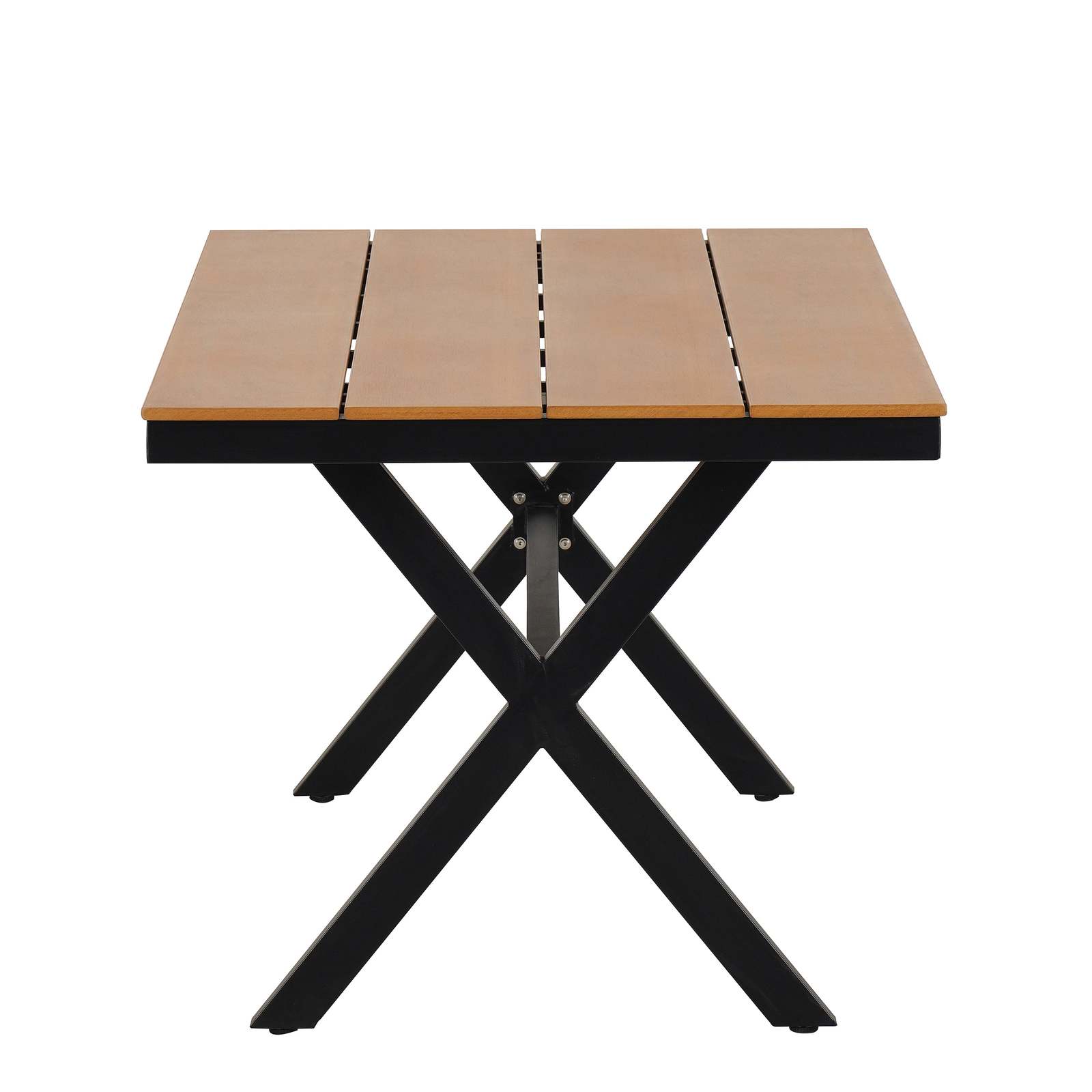 [Plastic Wood and Iron Table]: Crafted with a plastic wood tabletop and supported by a robust iron frame, the table ensures lasting durability and a clean, minimalist aesthetic. The plastic wood mimics natural wood, providing the beauty of wood without the maintenance.