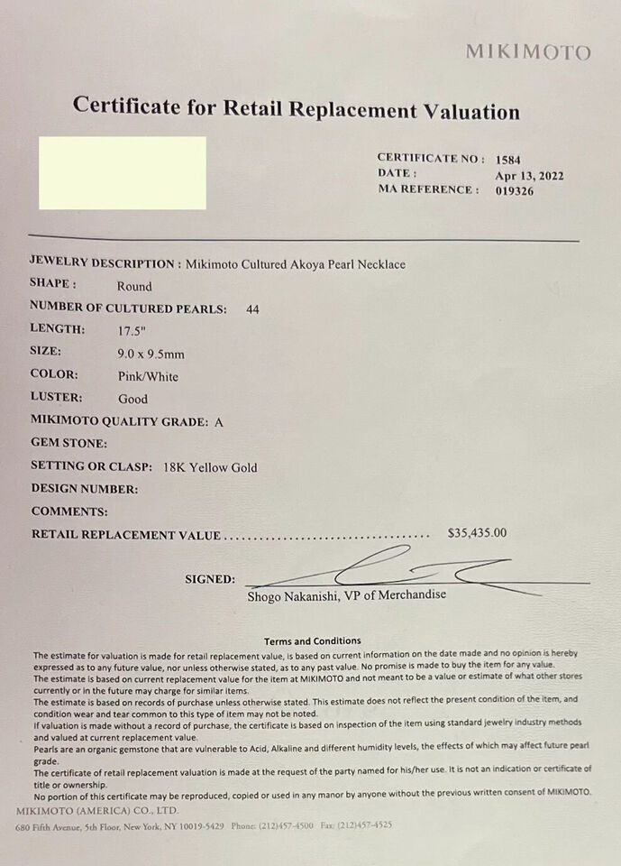 Certified and Appraised by Mikimoto in New York for the amount of $35,435