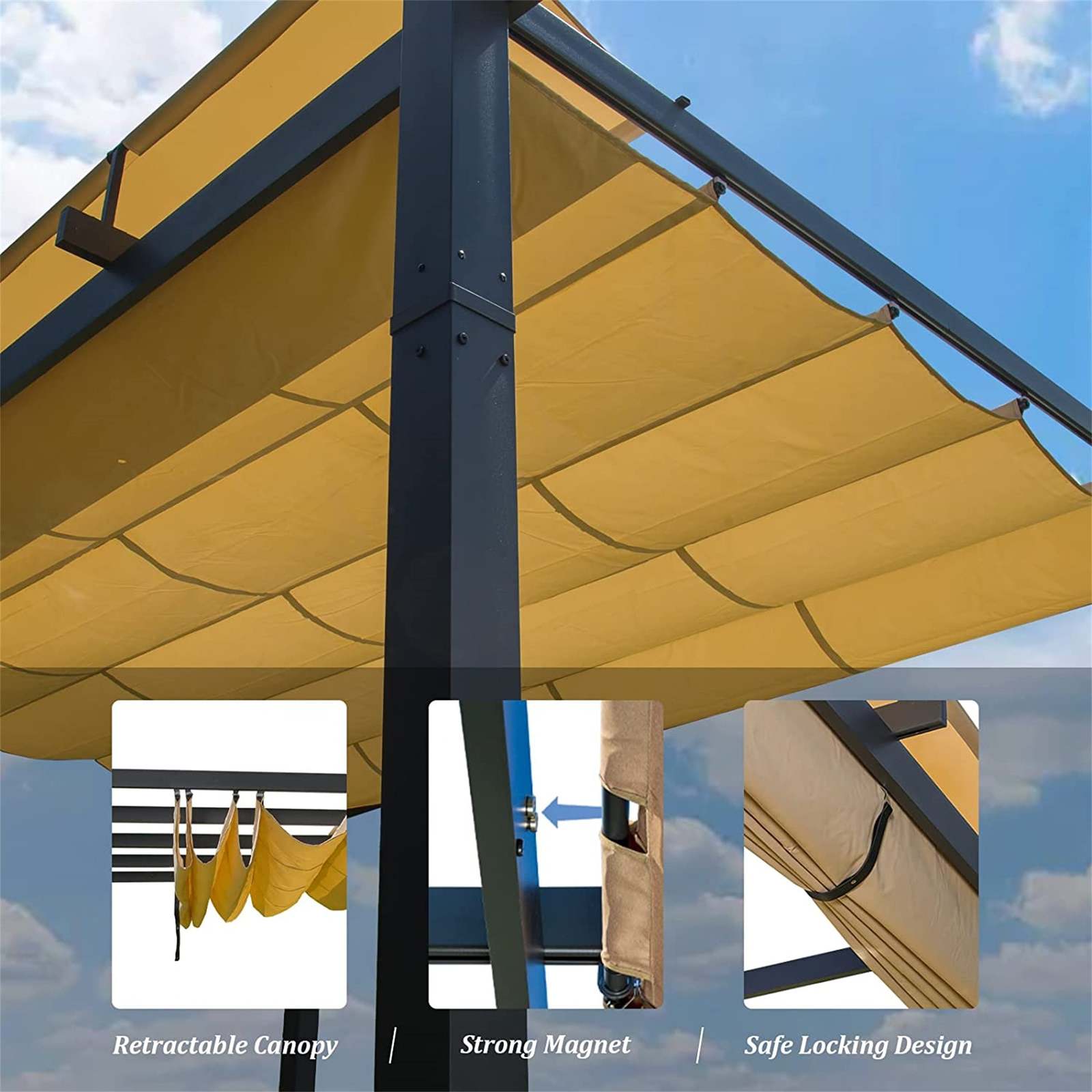 RETRACTABLE CANOPY: Control the perfect balance of shade and sun with a retractable pulley system,Adjust the optimal shade area according to your needs to block sunlight,UV rays,and light rain.