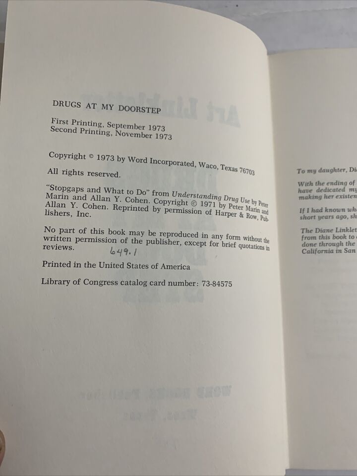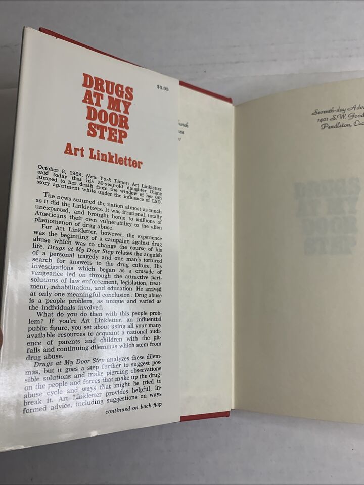 Drugs At My Doorstep Art Linkletter 1973 Hardcover Dust Jacket Word Books.