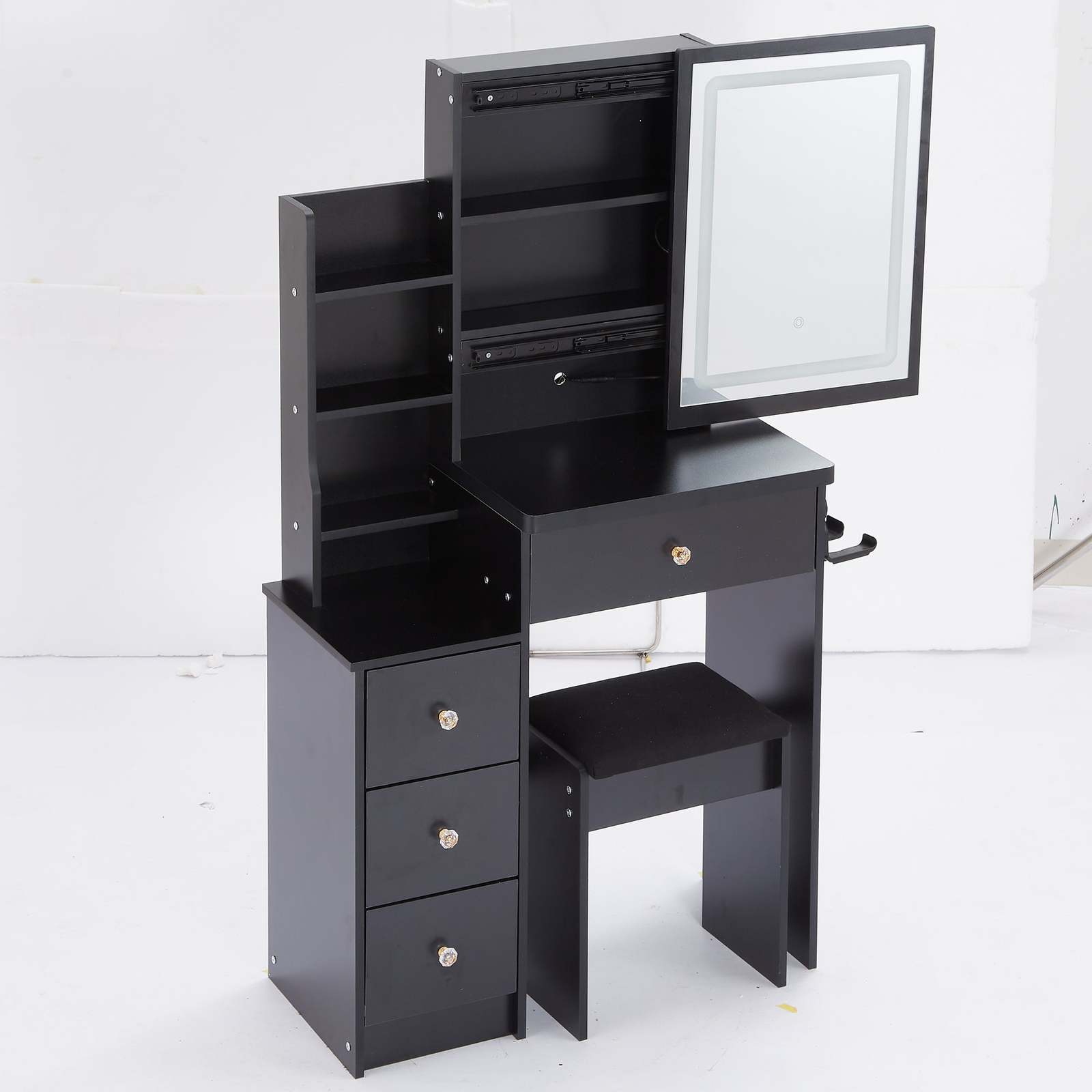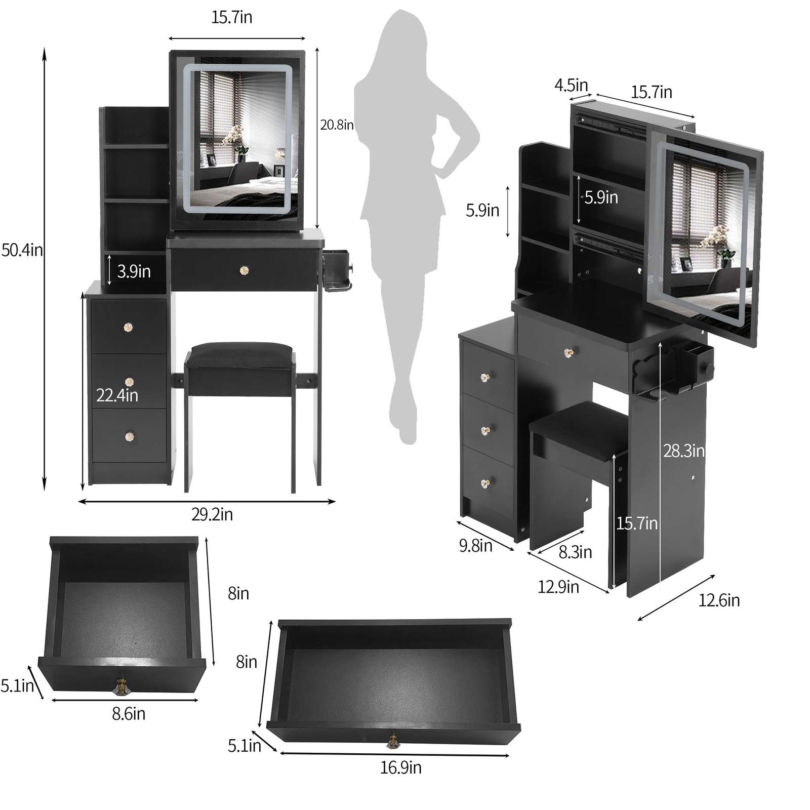 [Designed for small space]: This vanity table set is 29.2' in length and 50.4' in height, designed specifically for small bedrooms. Its advantage is that it takes up less space, so its size is not large. Before purchasing, please note that this is a small-sized dressing table, choose the appropriate size of dressing table according to the user's body shape and the size of the space where the dressing table is placed.