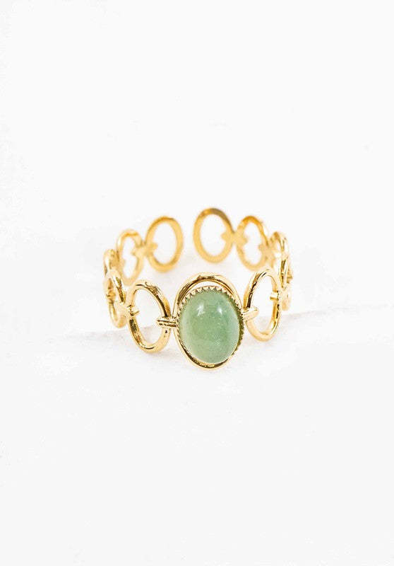 A gold adjustable ring with an oval seafoam-colored ring and oval ring bands.