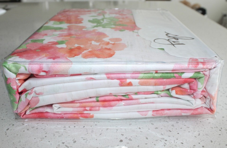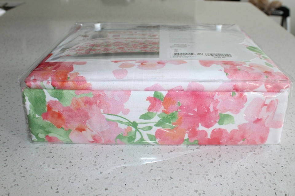 featuring a floral print with tones of pink, green, and orange atop a crisp white ground.