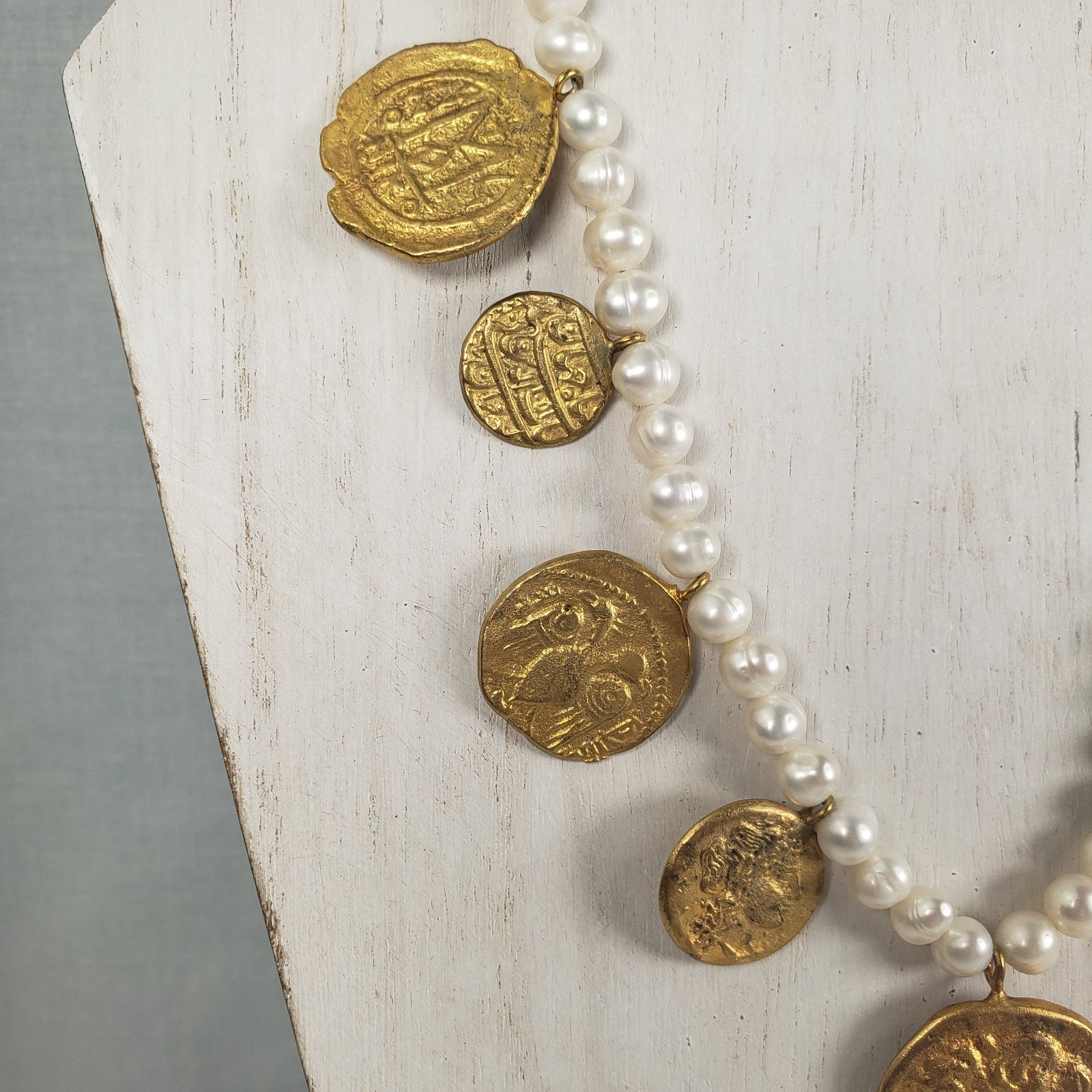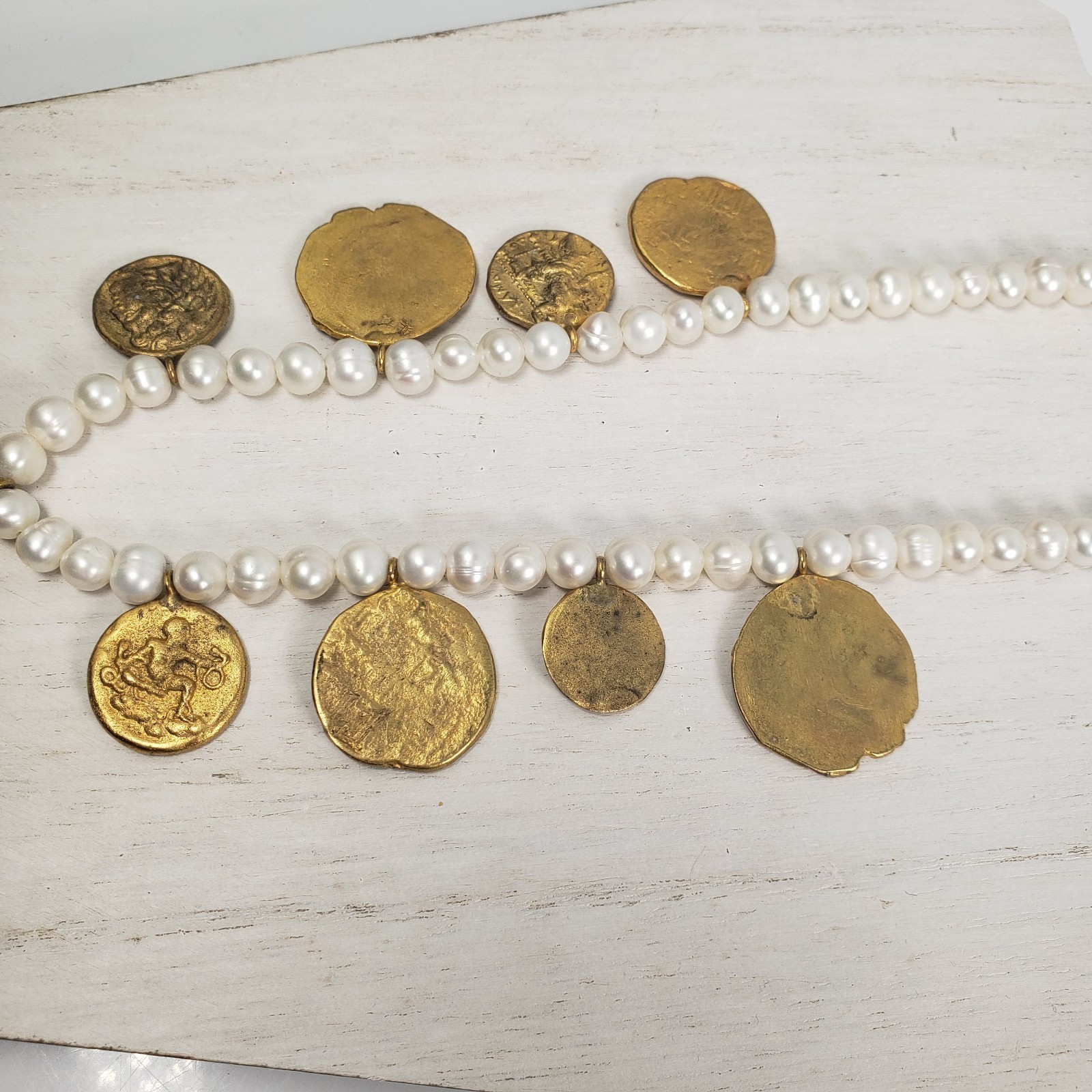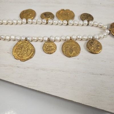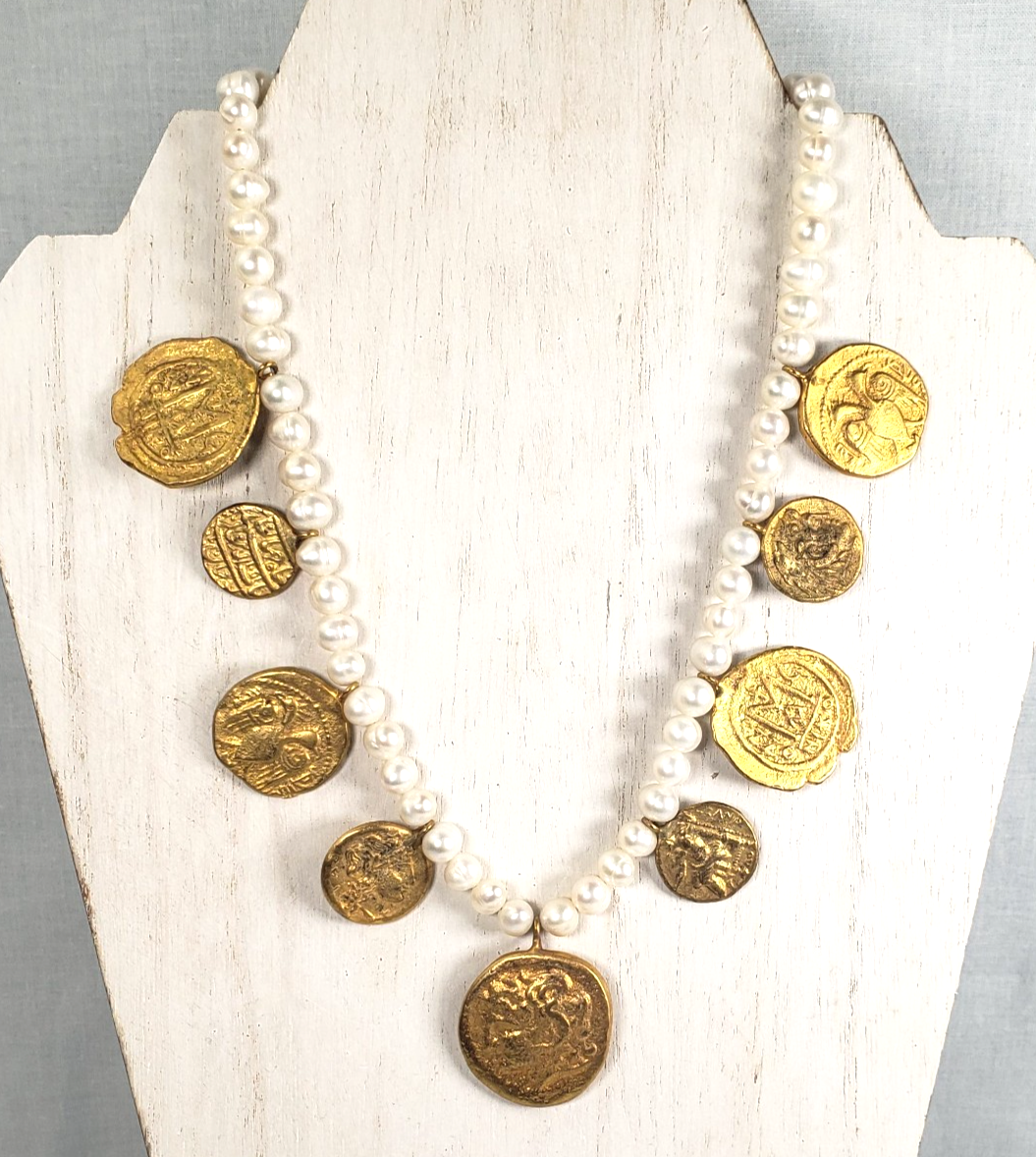 Vintage 1960's Signed Gypsy Handmade Coin and Freshwater Pearl 17" Necklace