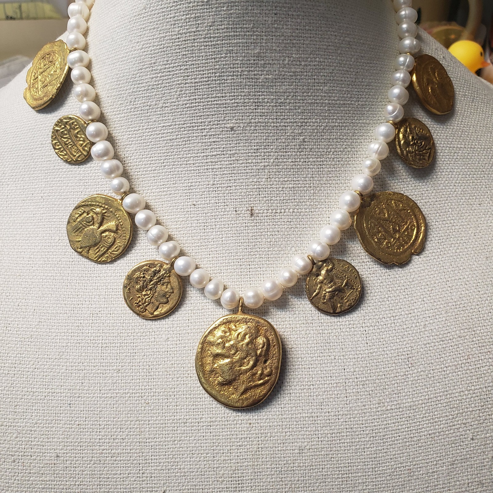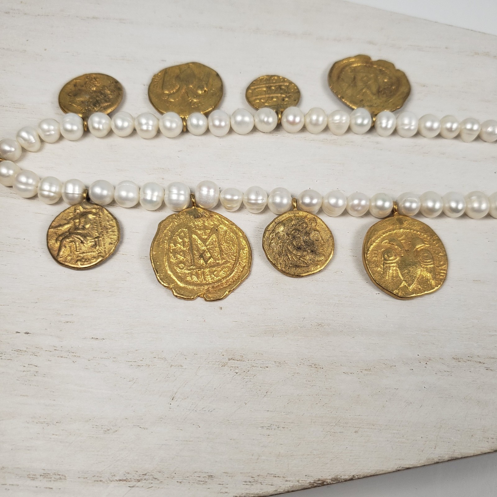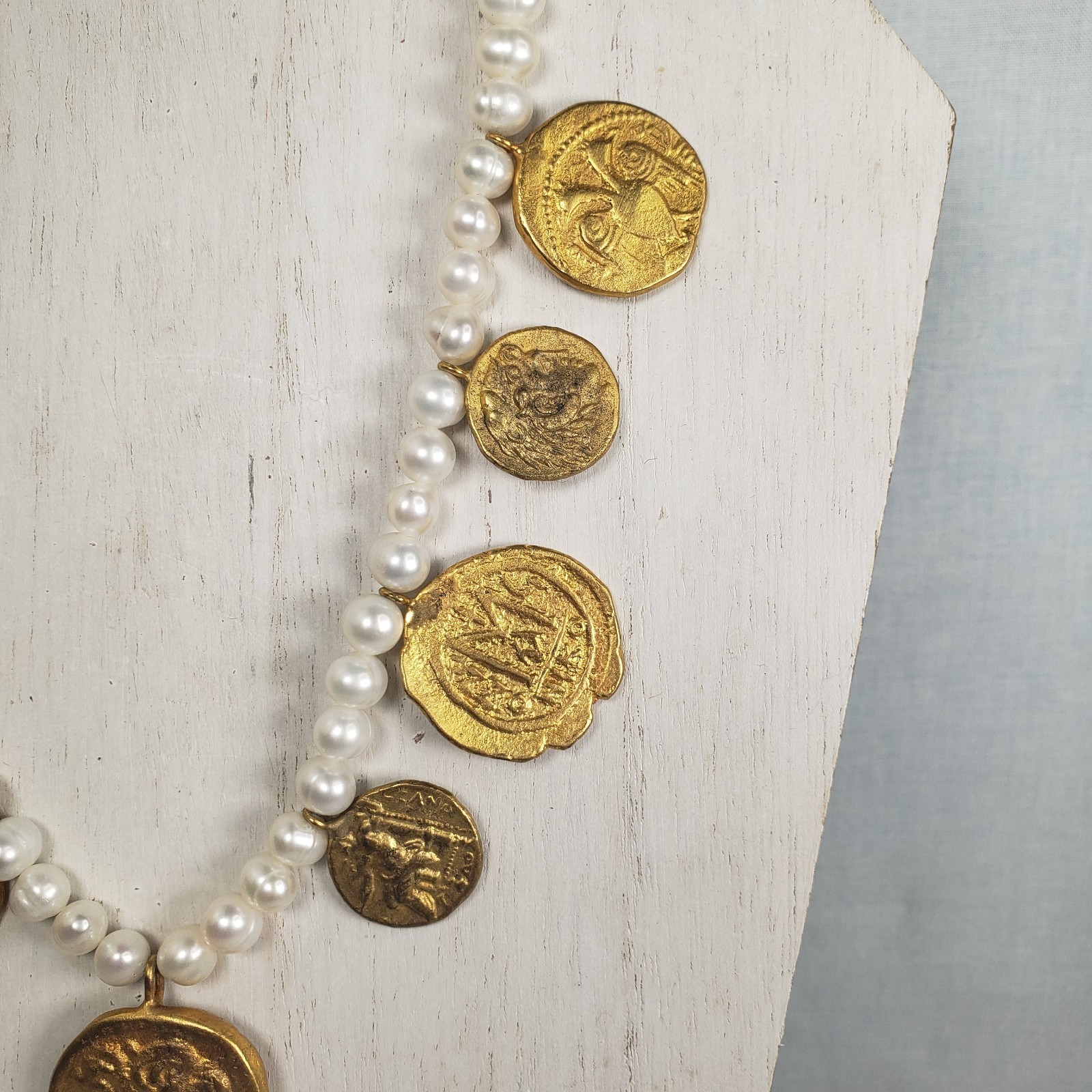 Vintage 1960's Signed Gypsy Handmade Coin and Freshwater Pearl 17" Necklace