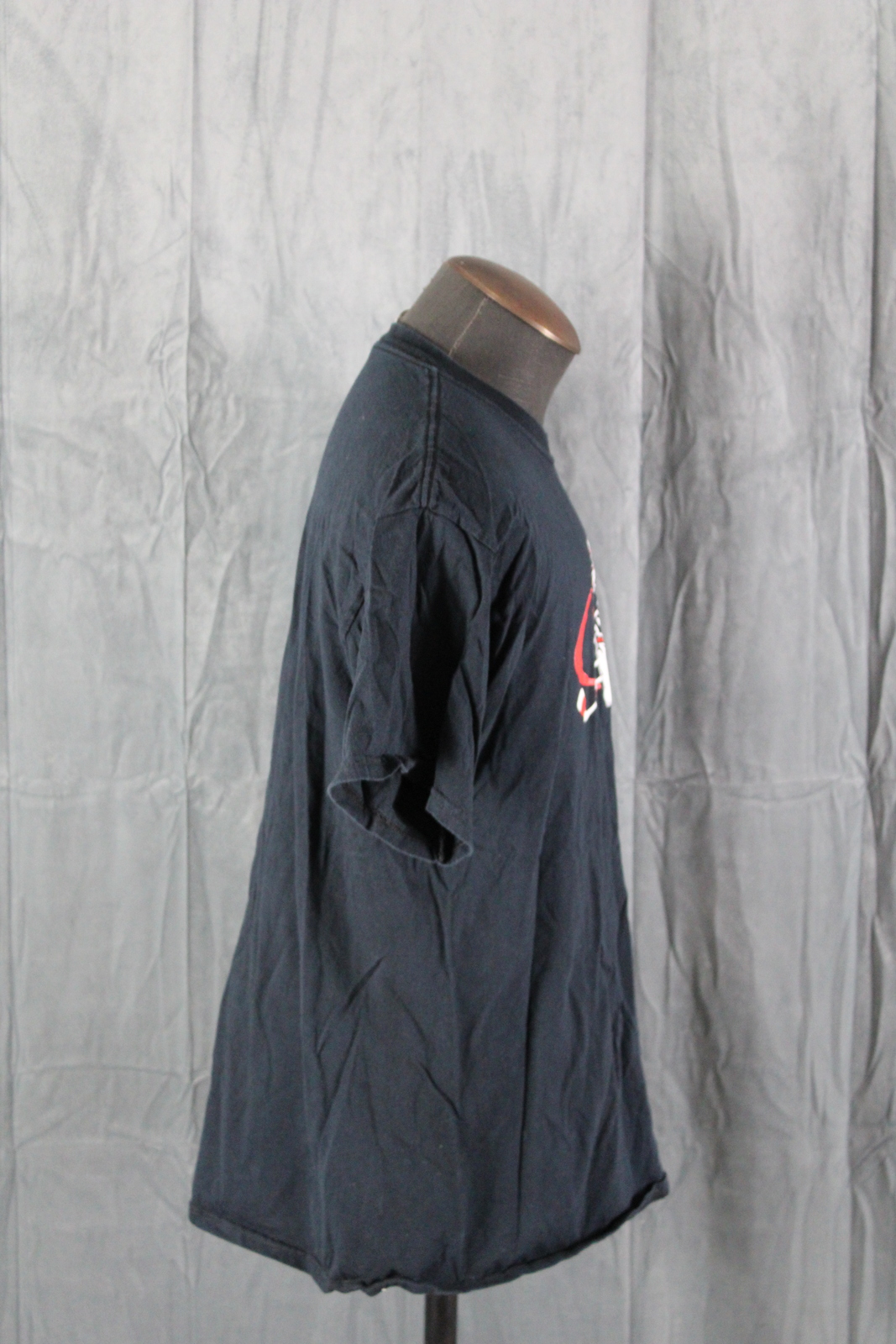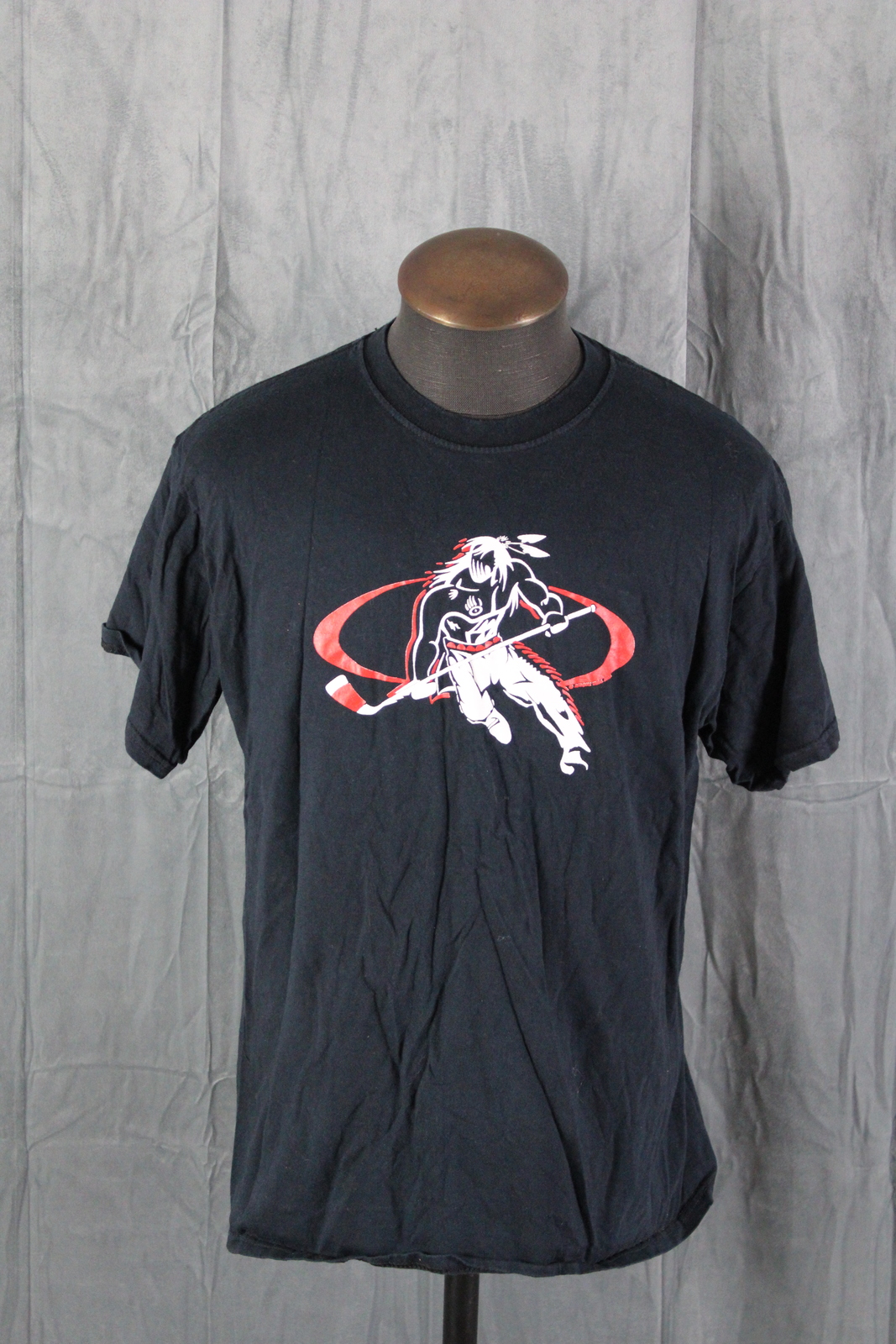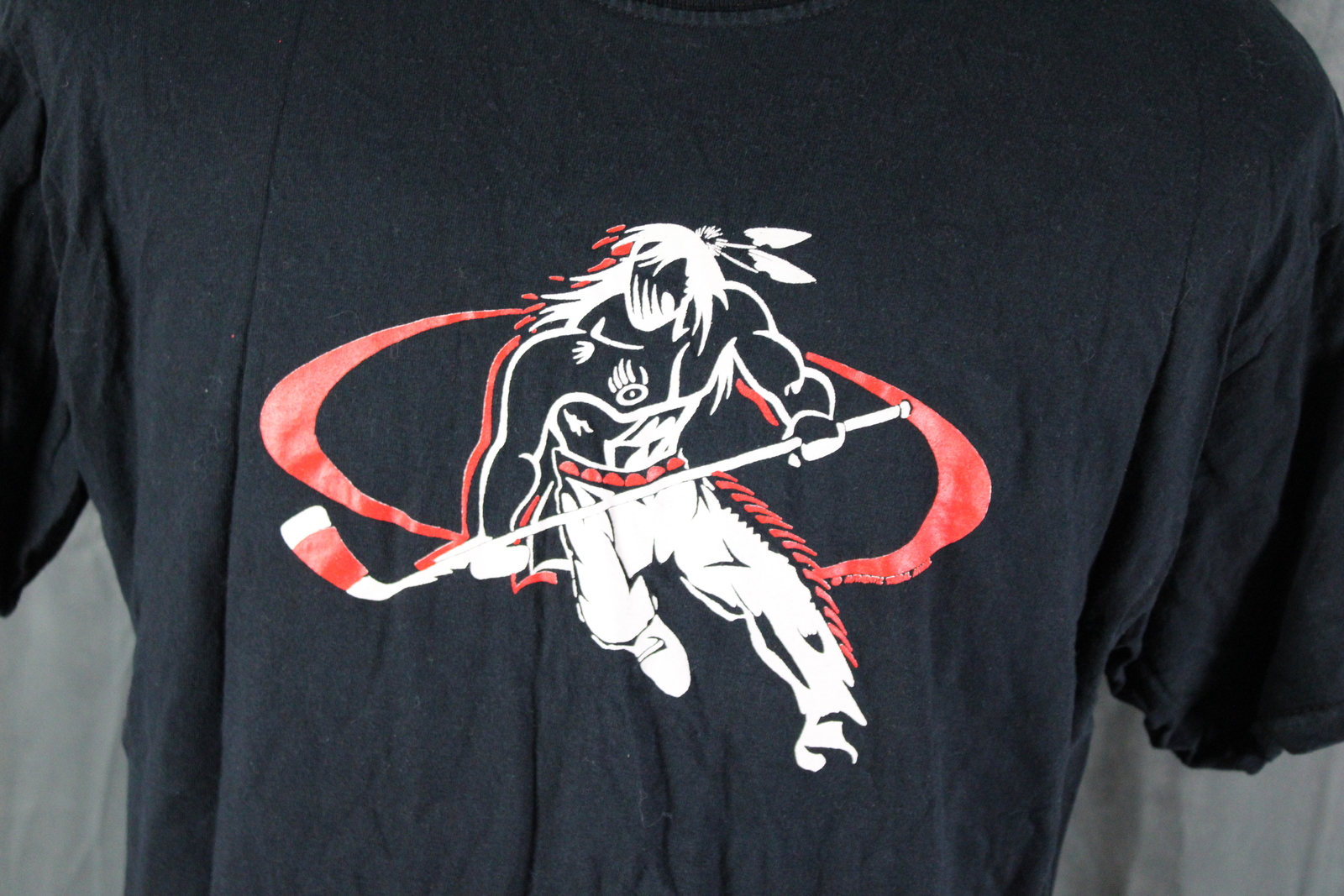 Up for asle is a local hockey shirt. It has a black base colour with a graphic of a first nations man shooting a slap shot screened on the front. What a great shirt do not miss out on it.