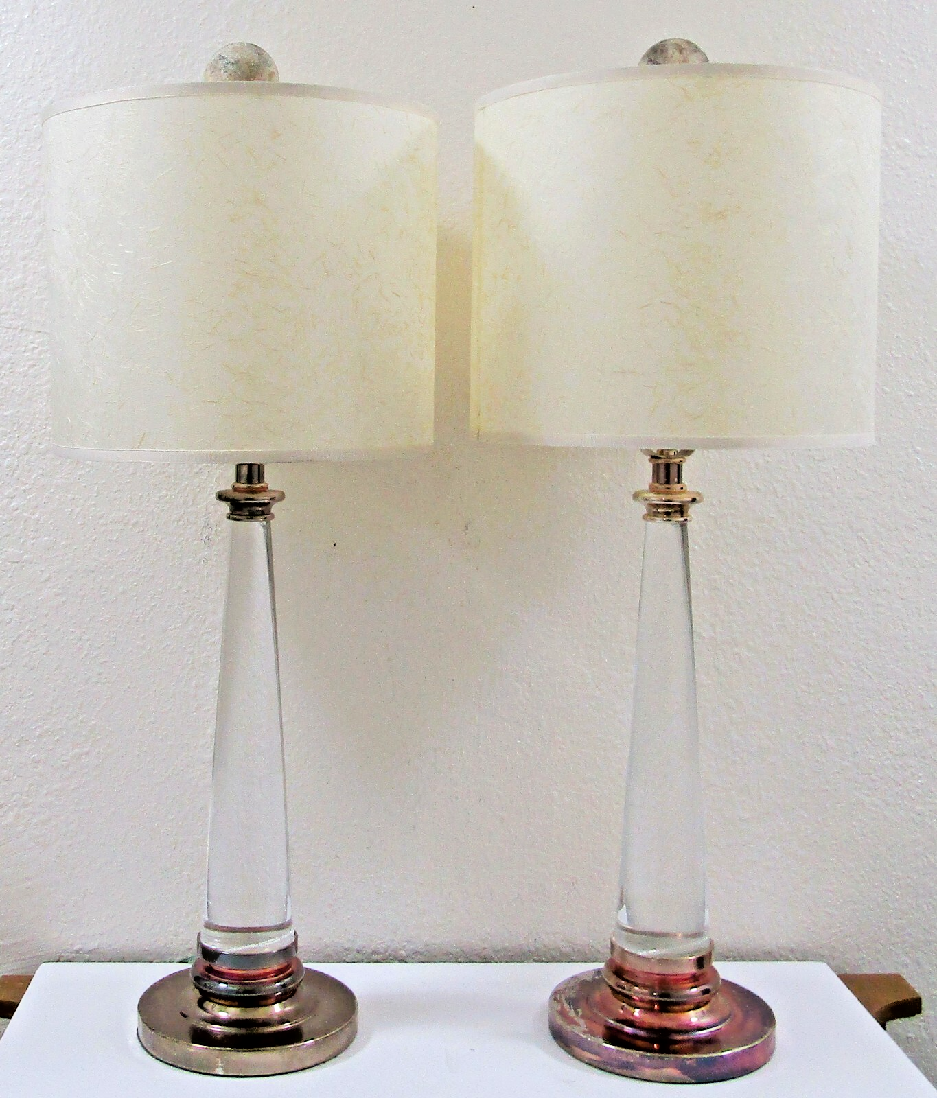 The lamps are powered by corded electric sources, ensuring a reliable and consistent supply of light. With clear cords that blend seamlessly with their crystal and silver aesthetics, these lamps offer a clean and uncluttered look. Complete with finials that add a classic touch, they're a sophisticated addition to any interior decor.