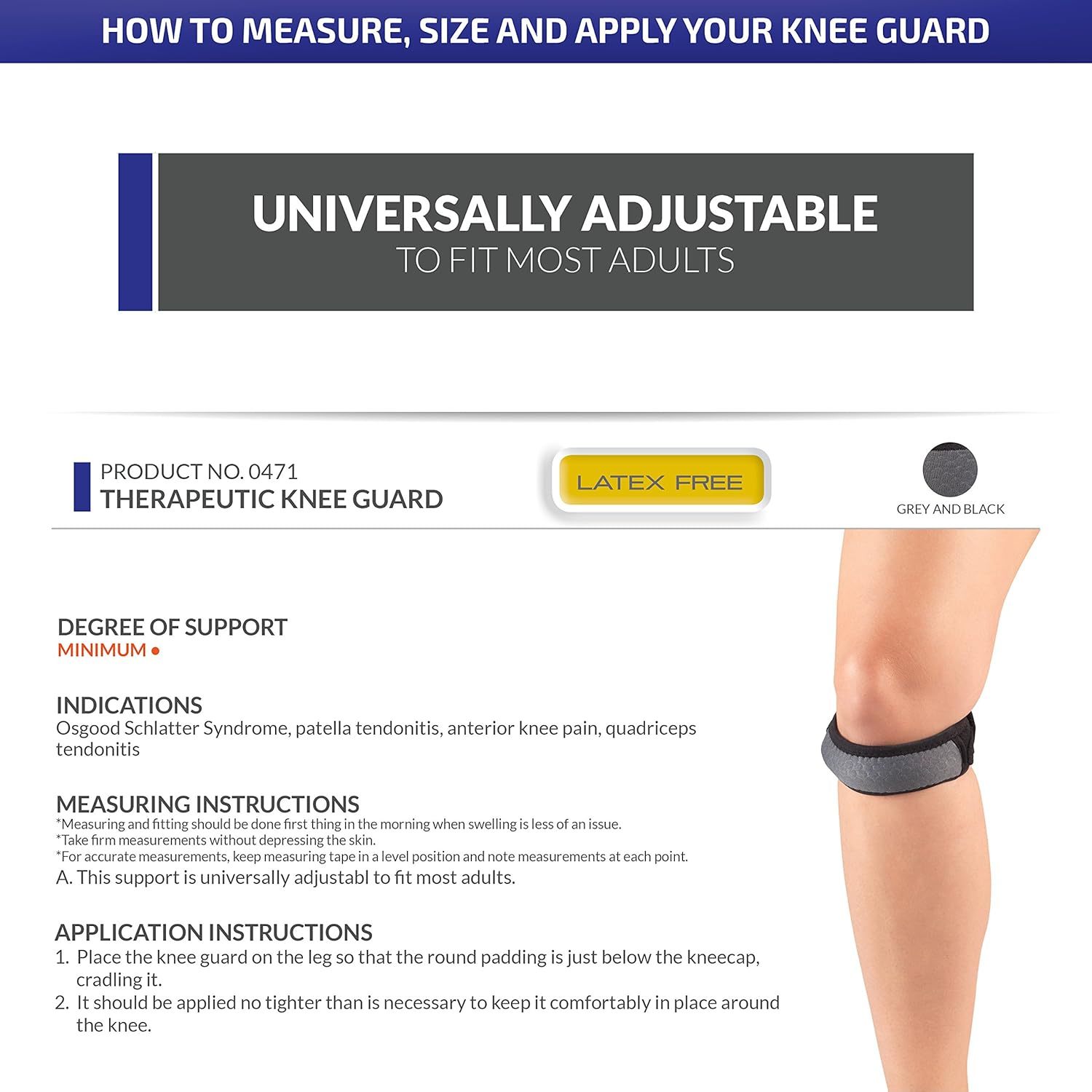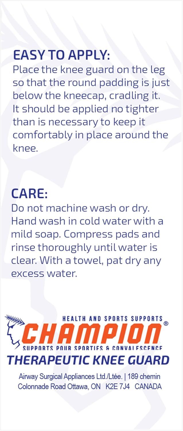 Champion brand (model C-471) therapeutic knee guard. This knee guard targets the causes of minor knee pain due to abnormal tracking or alignment of the knee cap. It works with the normal movement of the knee, applying pressure to the joint liner and patellar tendon to assist in the relief of minor pain.