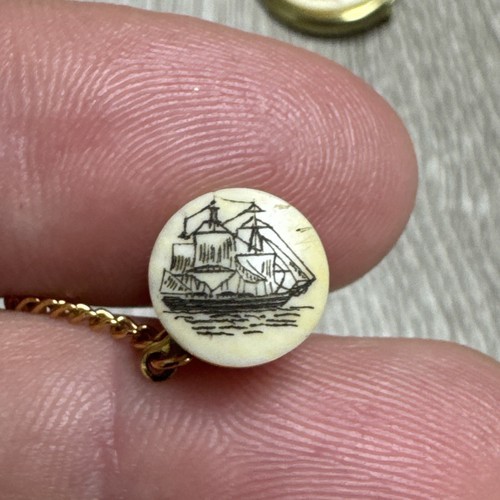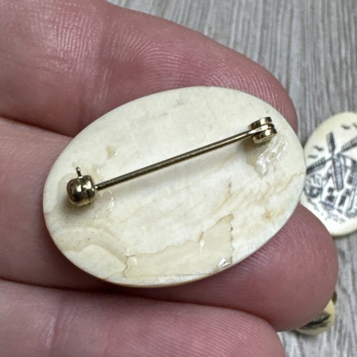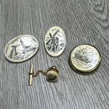 4 Vintage Scrimshaw Ship Whale Lighthouse Oval Brooch Gold Tone Frame Pin Tie JD