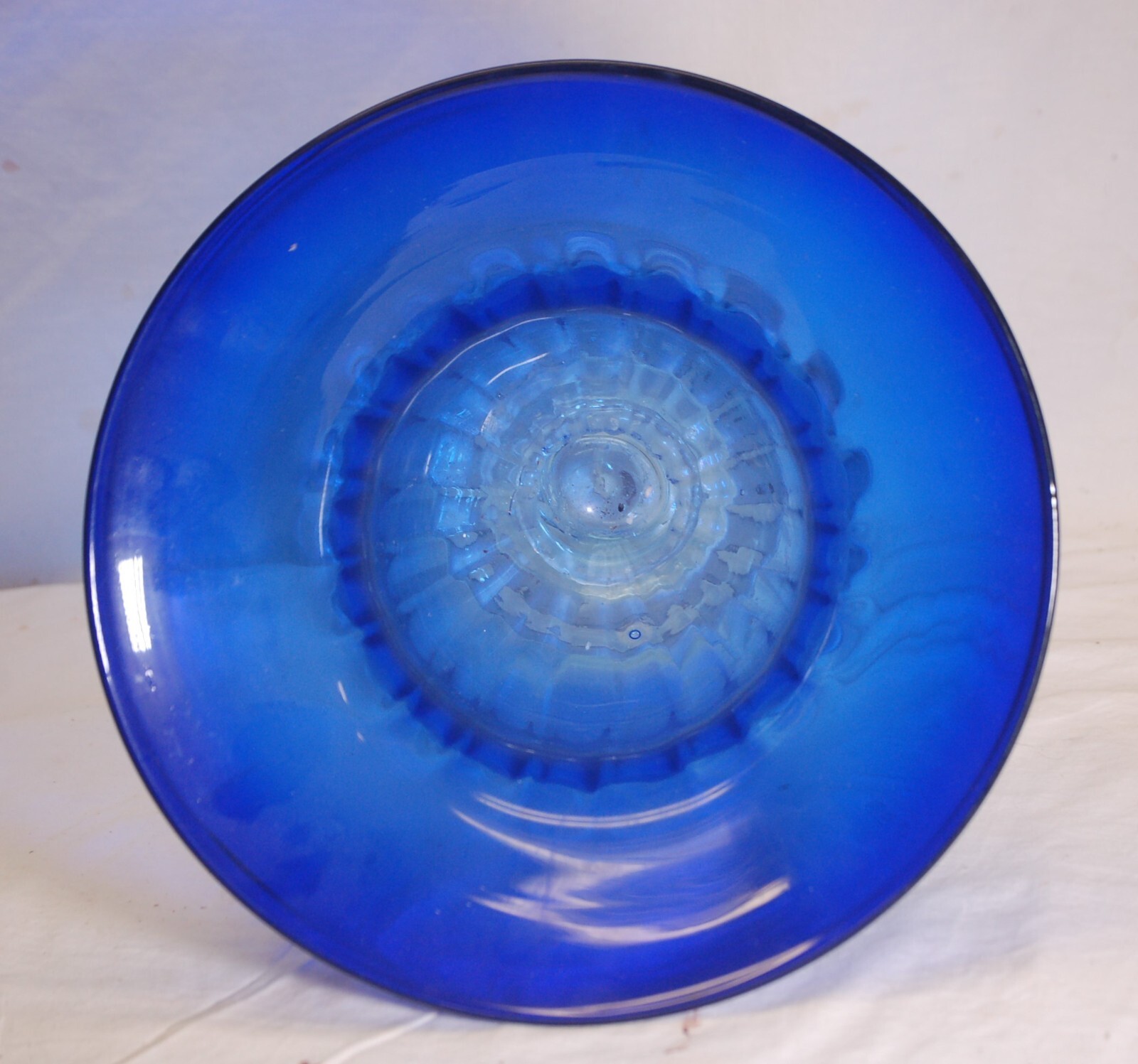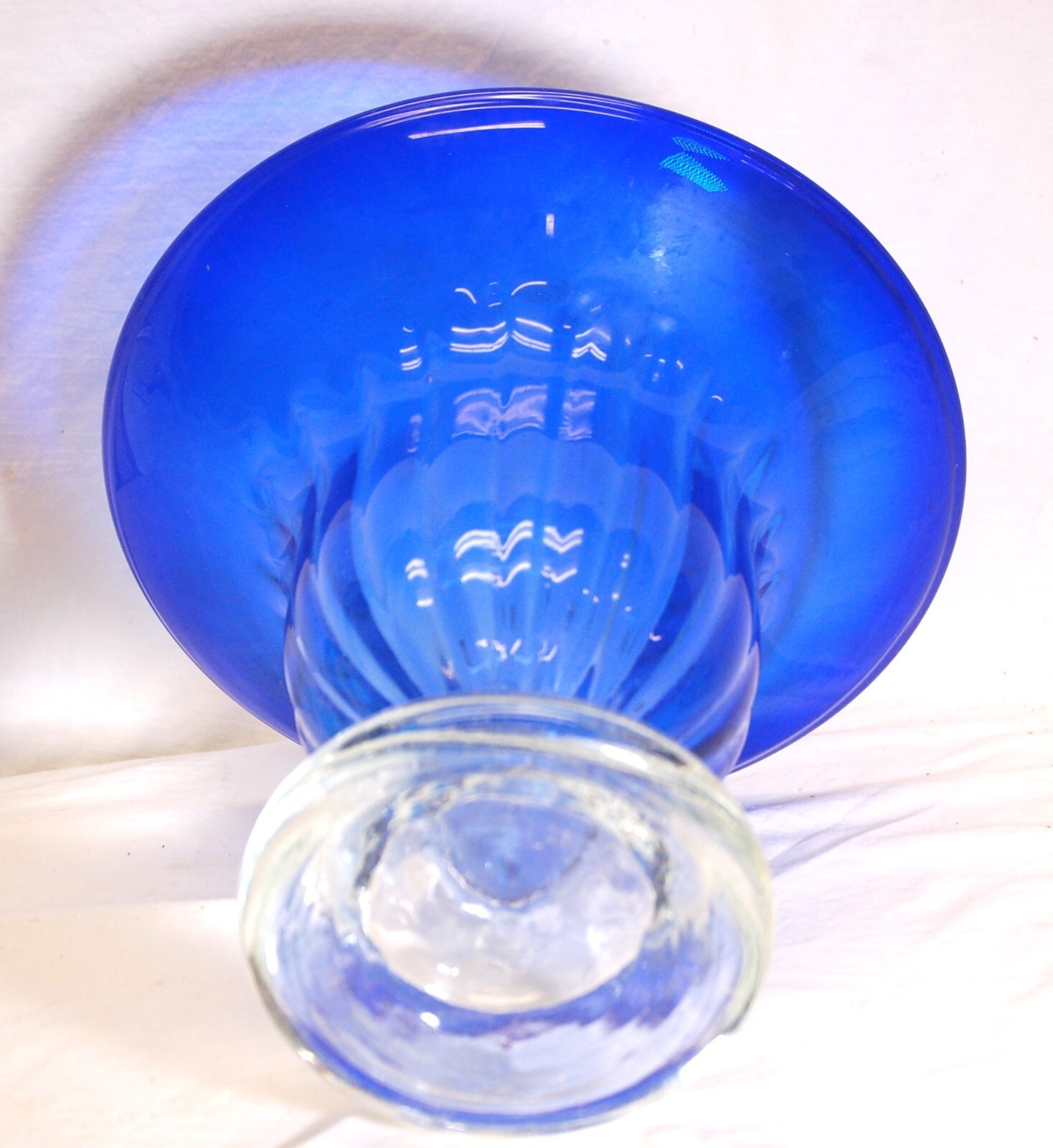 Cobalt Blue Glass Fruit Bowl Ribbed Sides Clear Base