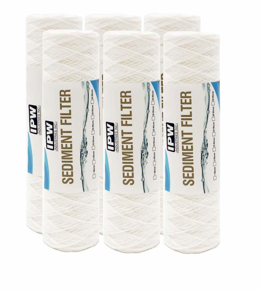 Pack of 6 string wound filter cartridges by IPW Industries Inc. These 10" x 2.5" cartridges fit most 10 inch filter housings. These filters are used as a prefilter of reverse osmosis (RO) systems and whole house water filtration. As well as a variety of commercial and industrial applications. String wound filters are used as the first line of defense in the filtration system, they protect your water using appliances and plumbing for cleaner water. String wound filters are a better choice compared to melt blown cartridges. String wound filters have a higher holding capacity, higher flow rate, and longer service life. Replace filters every 6-12 months for best water quality.