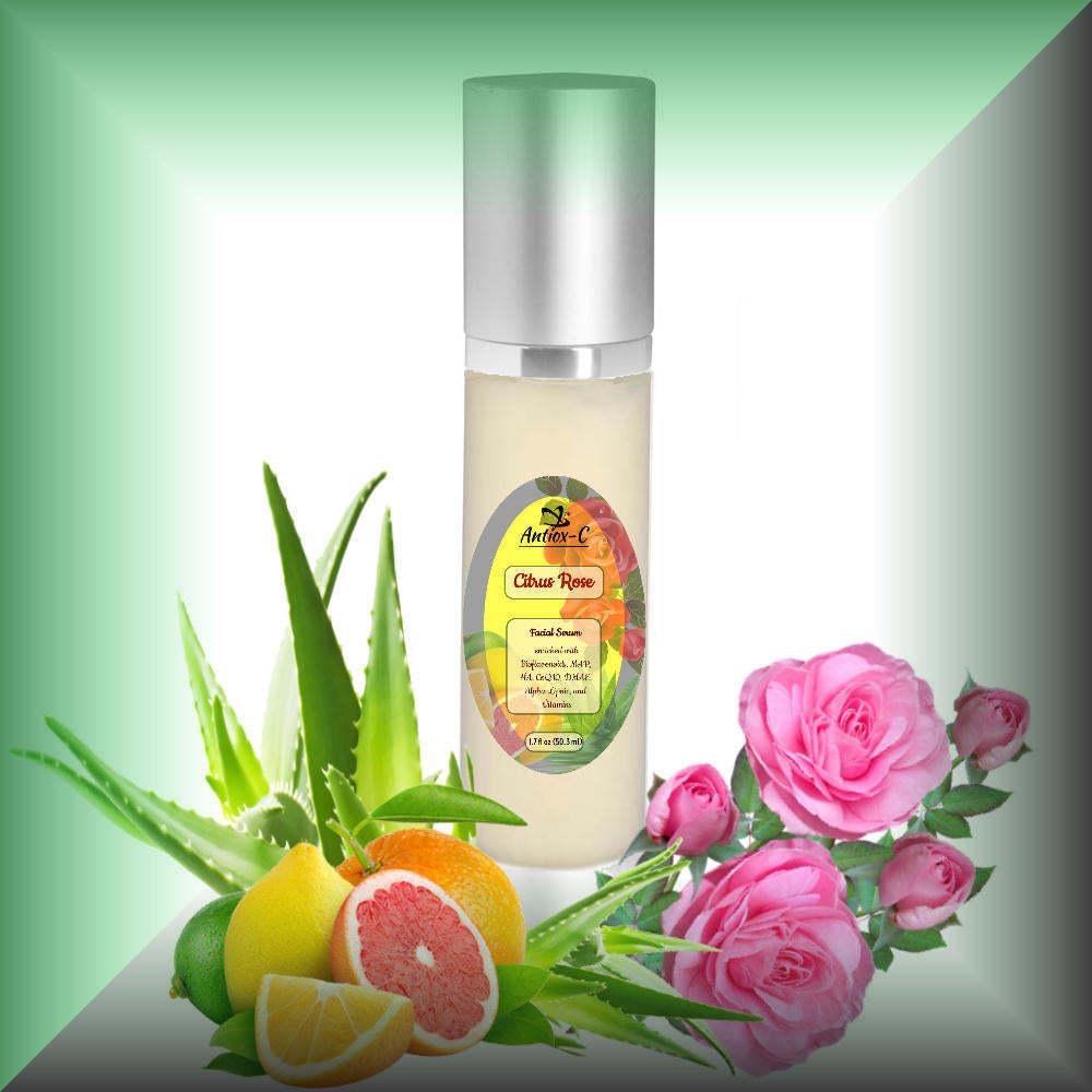 ANTIOX-C POWER ROSE Facial Serum with Magnesium Ascorbyl Phosphate (Vitamin C), Hyaluronic Acid (HA), Coenzyme Q10, DMAE, Alpha-Lipoic Acid, Retinyl Palmitate, Vitamins B3, B5, E, Bioflavonoids, and Rose essence.