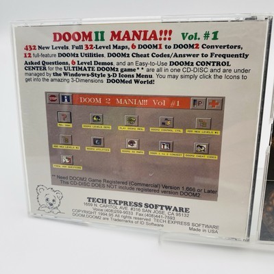 Hello, up for sale is a vintage 1995 CD-ROM for PC titled "Doom II Mania!! #1" featuring 432 new levels, utilities, and more. Published by tech express, this expansion cd for the popular shooter game series Doom offers an immersive and action-packed experience for mature gamers. This listing comes complete with disc, case, cover art and inlay. Disc is in very good condition with a few minor scuffs. Case has some moderate wear and a couple cracks present. Please note all PC software comes untested due to hardware limitations/variations. Please see pictures for more details. Be sure to check out my store for more. Add 3 or more items to cart and save 20%! Thanks for viewing.