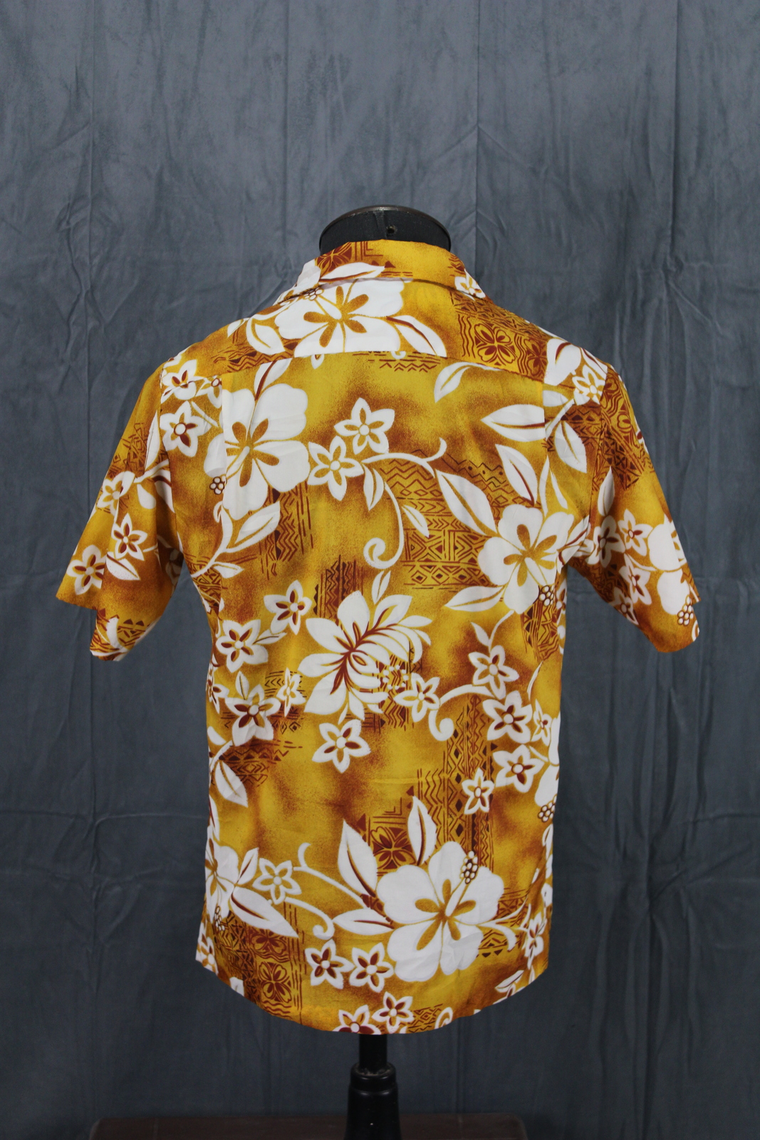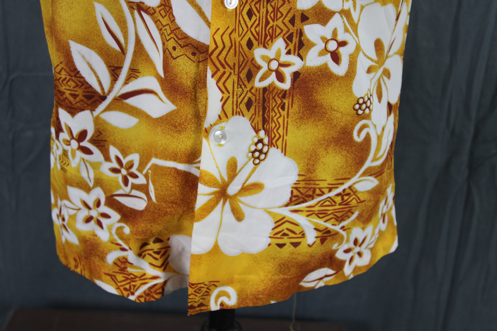 Vintage Hawaiian Shirt - Tan, Yellow and White Floral Pattern Pomare - Men's MED