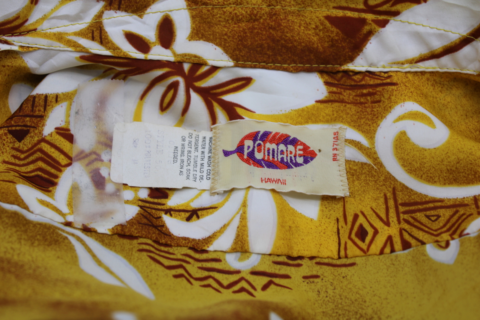 Up for sale is a vintage Hawaiian shirt by Pomare. It has a yellow base colour with a white a tan floral pattern over top. What a great shirt do not miss out on it.