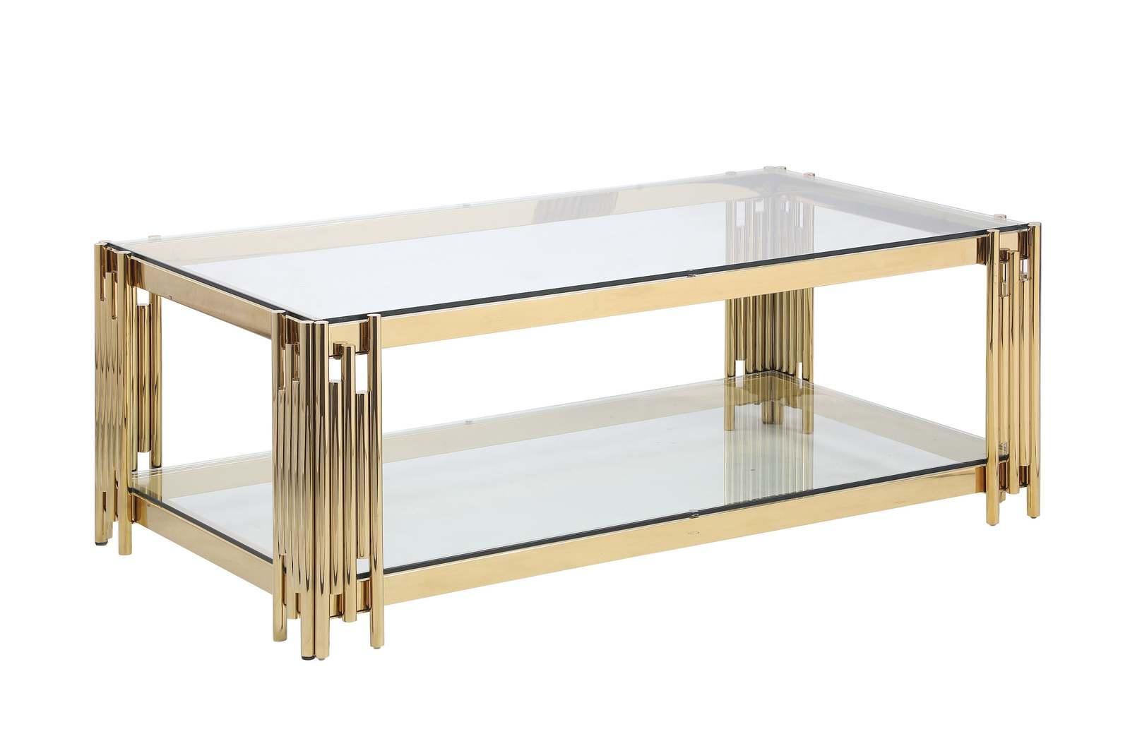 With two shiny tempered glass shelves and Irregular cylindrical stainless steel pipe welding, this gold coffee table is designed to stand out in your home.