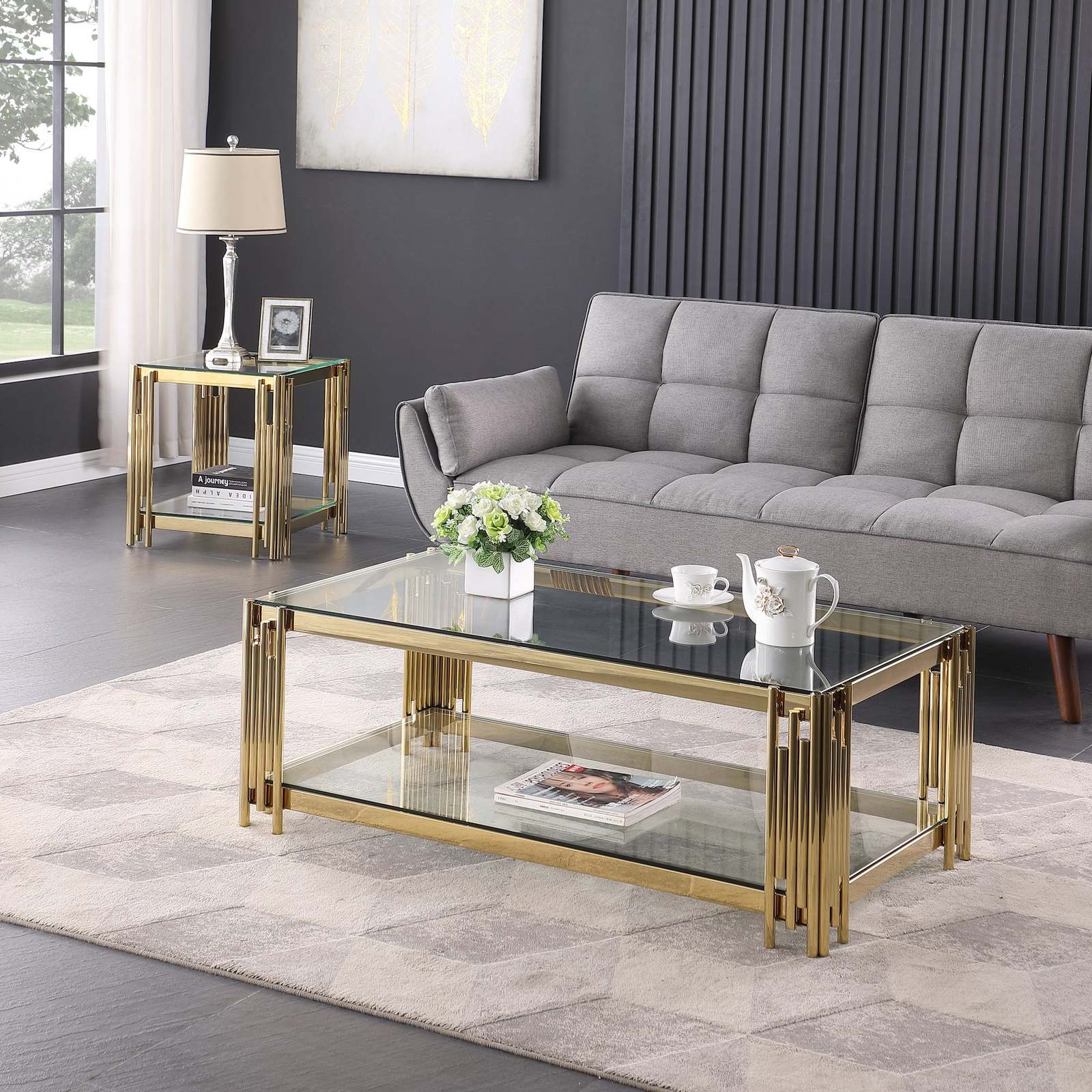 Beautiful touch of modern to your home with the glass gold coffee table.