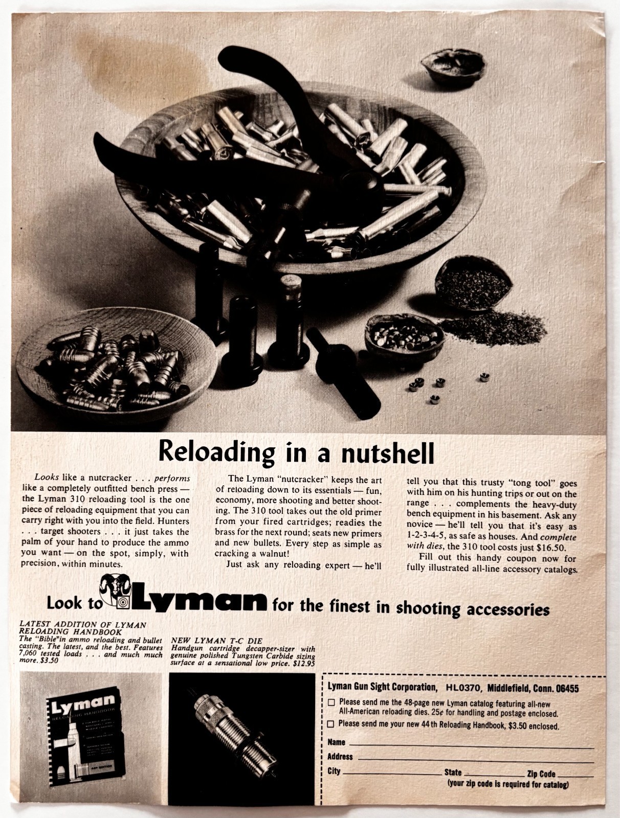 1970 Lyman 310 Reloader Tool Advertisement Hunting Firearms Supply Vintage F15W