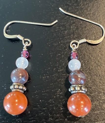 Vintage Dangle Round Stone Beads and Gold-Tone Earrings, Fall Colors