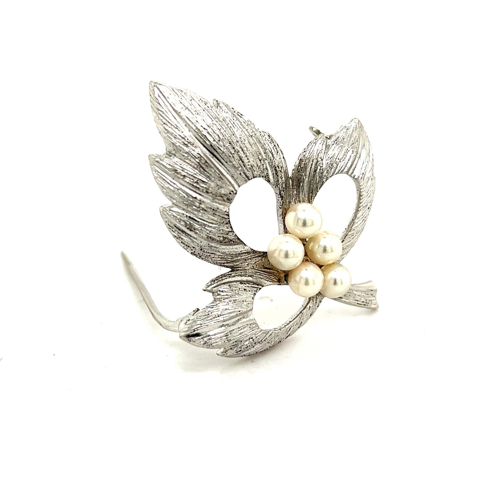 Mikimoto Estate Akoya Pearl Leaf Brooch Pin Sterling Silver 4.5 mm M296