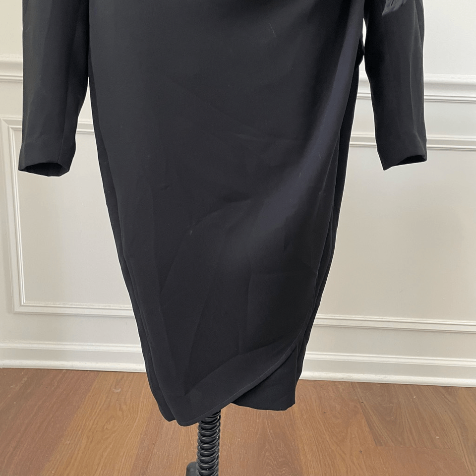 Women?s Jones, New York little black dress with long sleeves and knotted waist perfect for professional use or funerals or anywhere a modest black dress is needed. Lined. Lay flat measures approximately 39 inches shoulder to hem, 21 inches armpit to armpit and 16.5 inches straight across the waist. 19 inches across the hip as the waist is currently knotted but I believe that is a little bit adjustable.