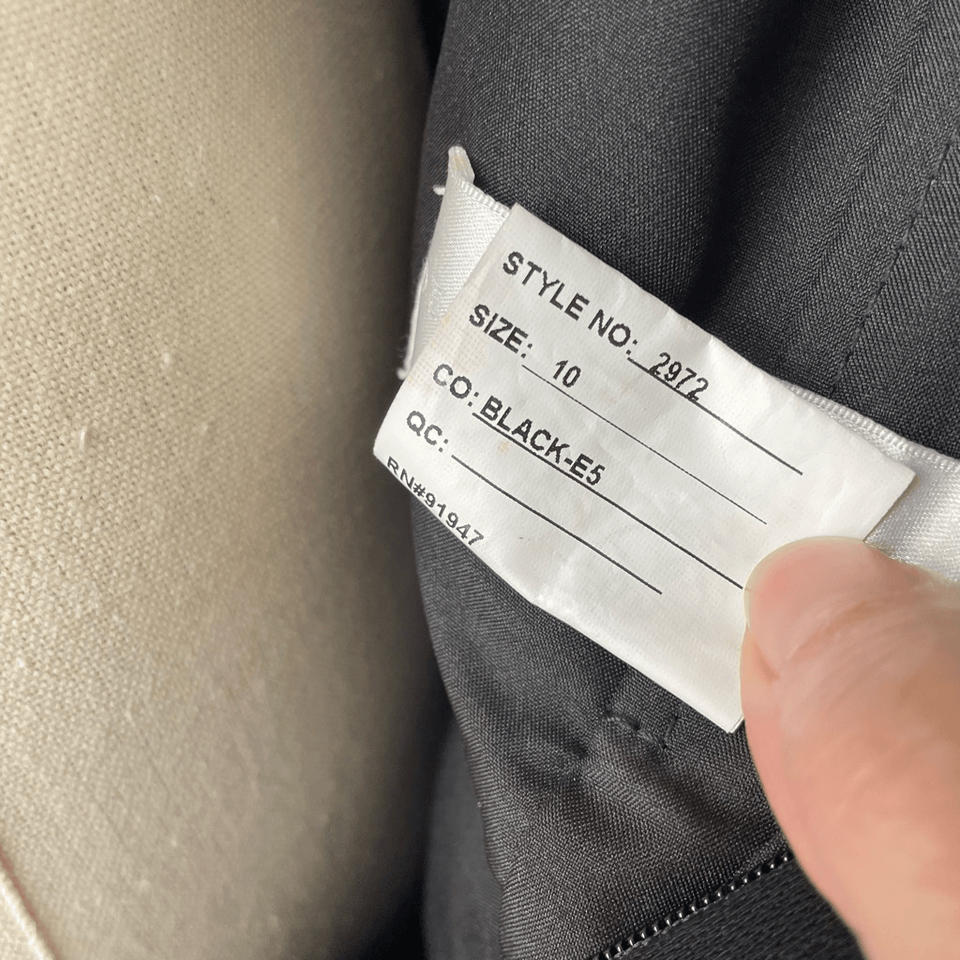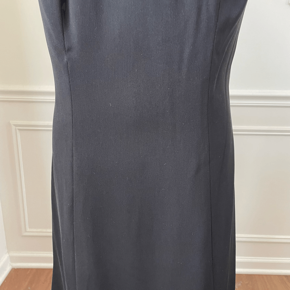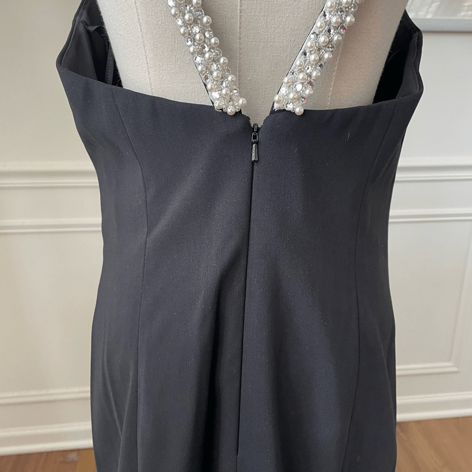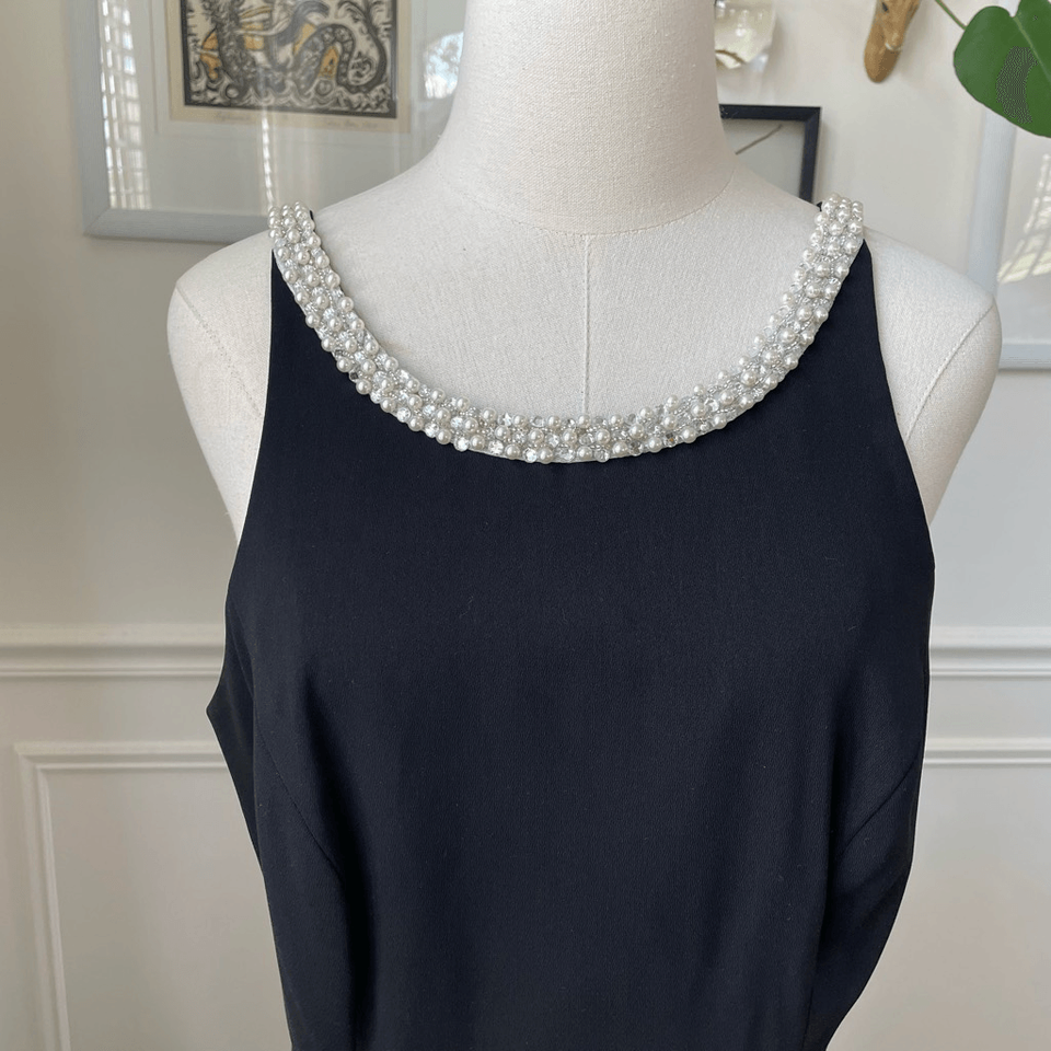 Dessy Collection by Vivian diamond 100% polyester formal dress or gown in black with a mermaid style cut fitting through the waist and hip before flaring out at the knee. The style is very 90s with a high round neck is trimmed in pearl, rhinestone and glittery clear seed beads. It carries to the straps over an open low back before hitting the zip closure. 100% polyester and the lining is also polyester with a little bit of spandex. Tag size 10. Laying flat measures 18.5 inches armpit to armpit with seams in the front that accommodate cup size. 15 inches straight across the waist, 17 inches across the hip and 62 inches shoulder to hem.
