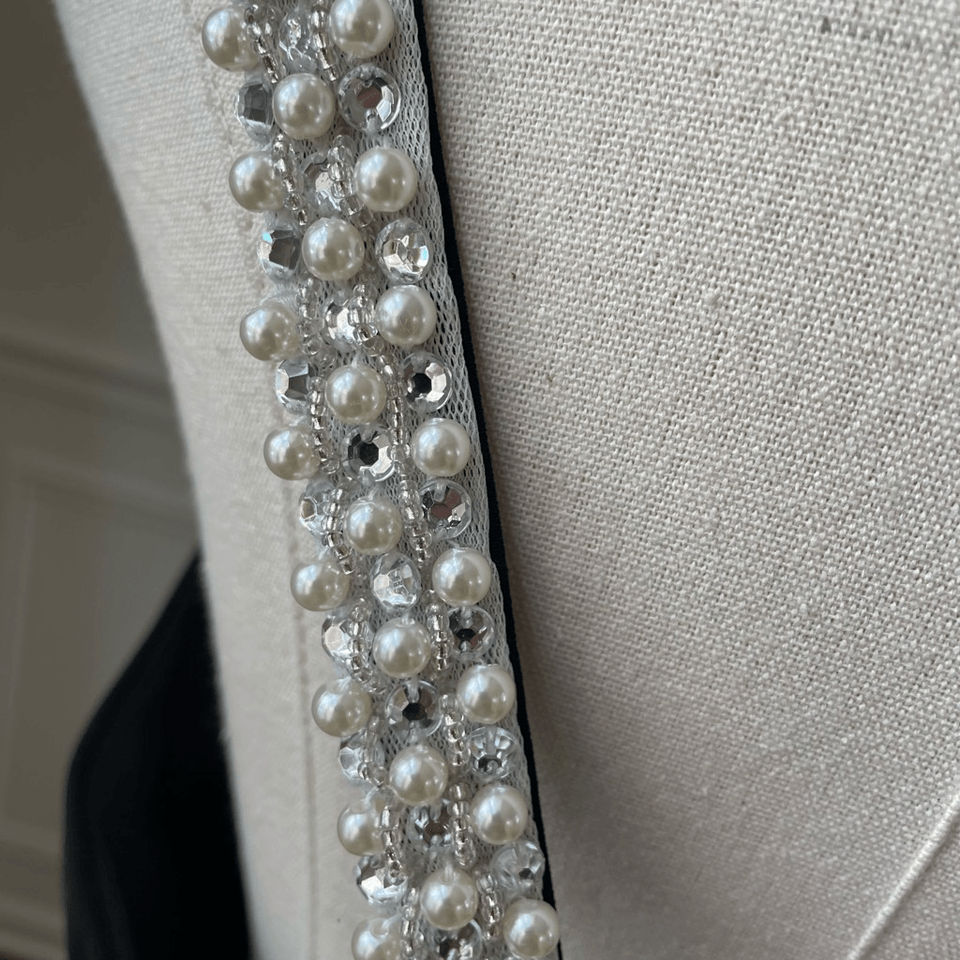 Dessy Collection Vivian Diamond Mermaid Gown Pearl Rhinestone Open Back Black 1