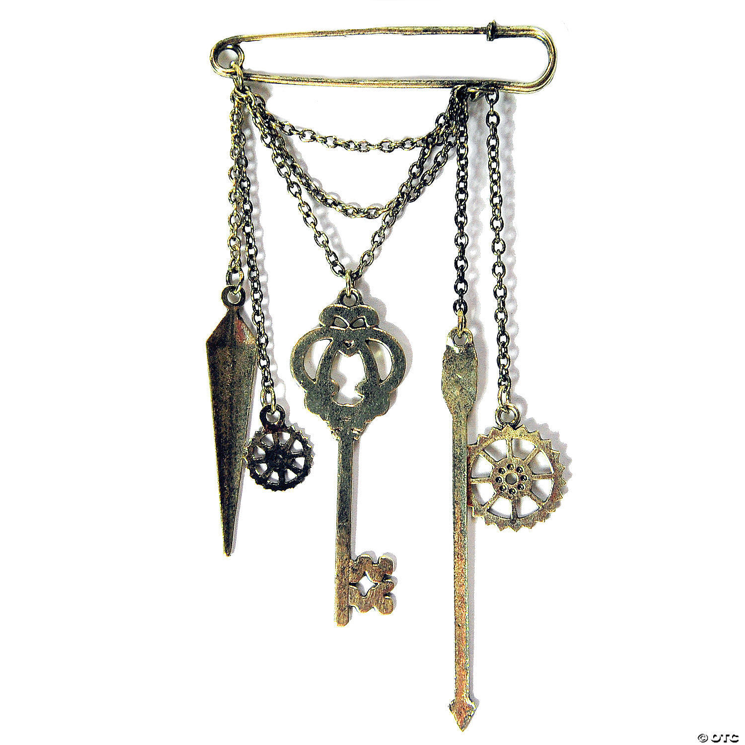 Oversized Pin Drape with IconsGreat addition to your Steampunk costume! Includes: Antique style metal safety pin with five metal icons hanging from metal chains. 2-1/4" wide X 4-3/4" lon.