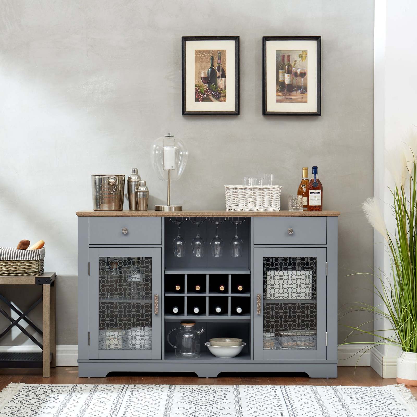 [Large Storage Space] Featuring 2 drawers, 2 large cabinets with adjustable shelves, 4 glass racks and 8 wine bottle slots, this cabinets can easily store all your bar related essentials. The 56.5' countertop is perfect for coffee maker, microwave oven, or other appliacnes.
