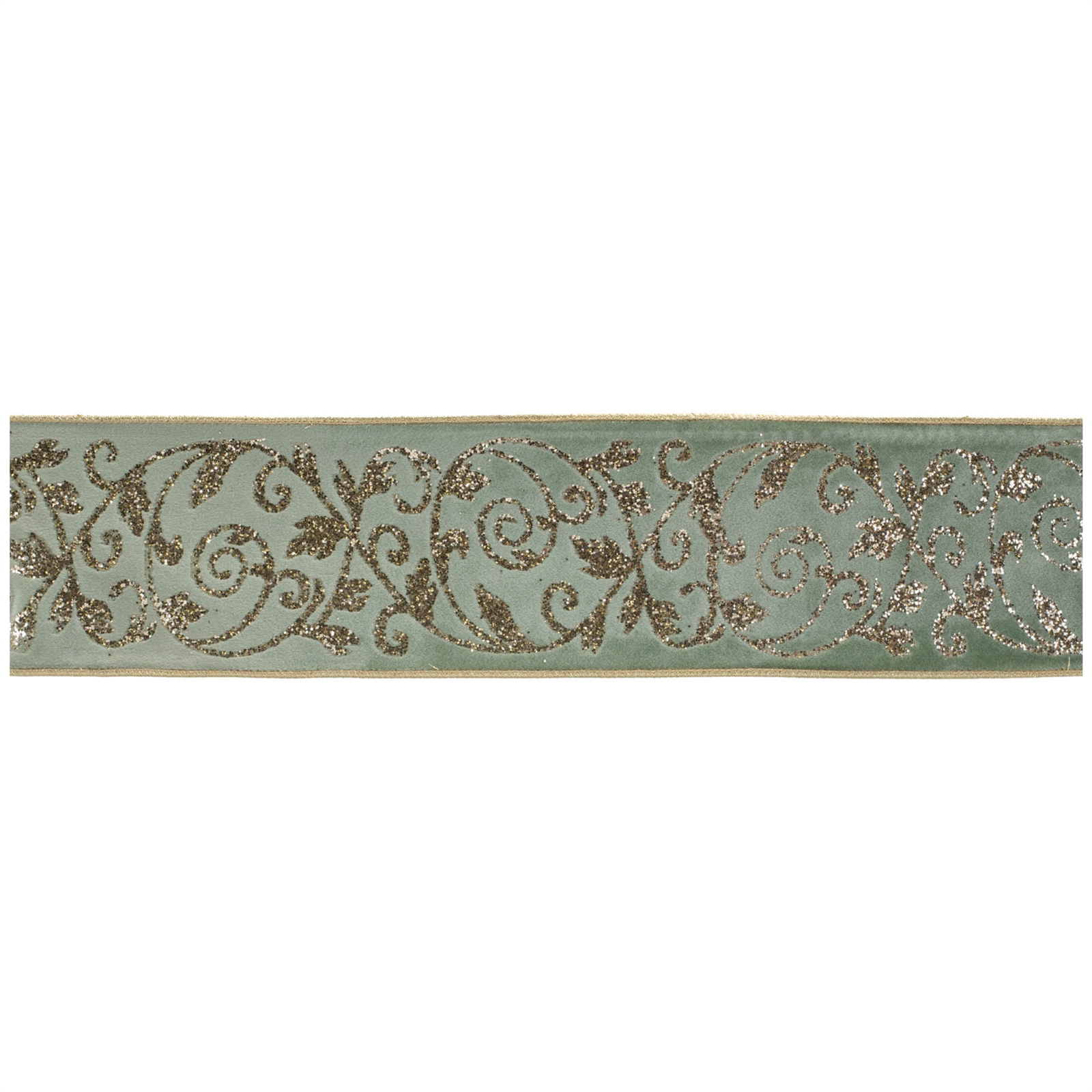 Add an elegant touch to your holiday creations with this ornate glittered wired ribbon. Featuring wintry green tones with chic champagne trim, this ribbon showcases a stunning glittered ornate pattern that adds a sophisticated sparkle to your decor. Measuring 4" wide and 5 yards long, it s wired for easy shaping and sturdy displays. Perfect for holiday arrangements, gift wrapping, and crafts, this ribbon brings a luxurious, festive feel to every project.