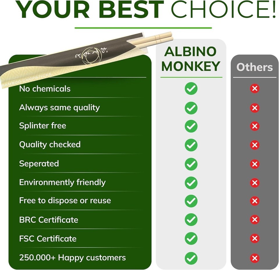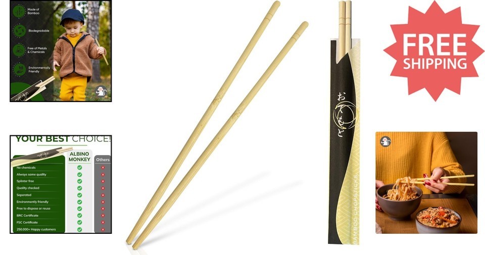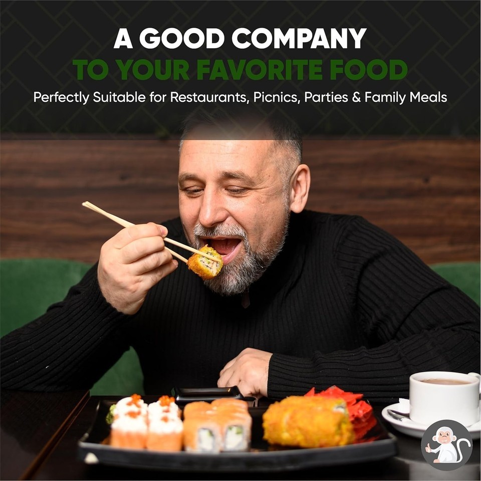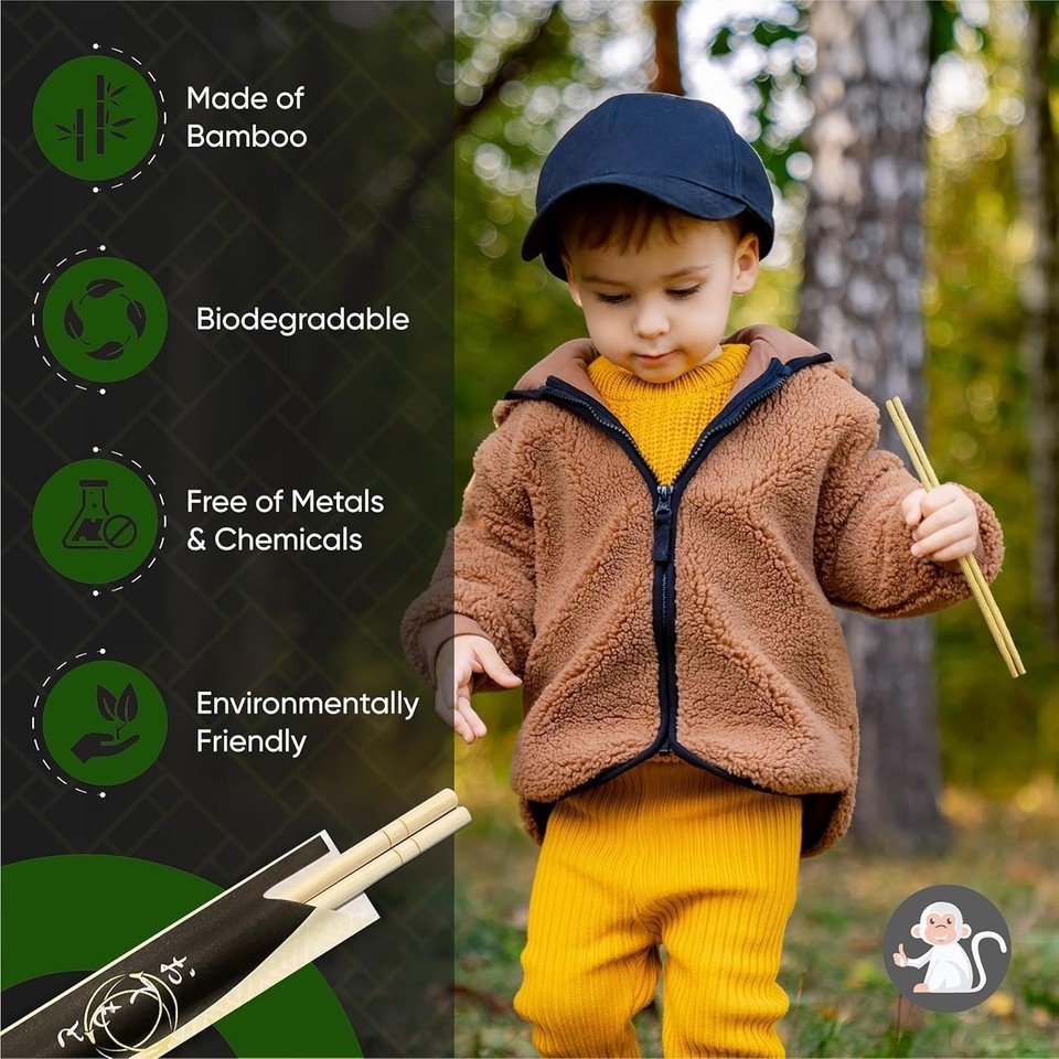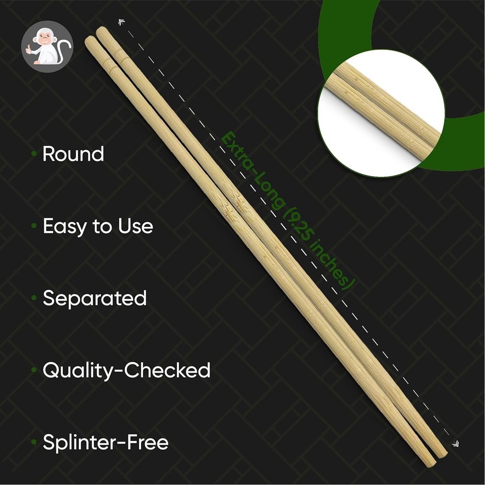 Experience the eco-friendly elegance of our 9.25-inch disposable bamboo chopsticks, inspired by the acclaimed Albino Monkey design. Crafted from sustainable bamboo, these non-slip utensils are perfect for beginners and seasoned diners alike, ideal for sushi, noodles, or any Asian cuisine. Each pair features rounded ends with no splinters, ensuring safety and comfort. Meticulously checked and hand-packed, every package contains 100 pairs of high-quality chopsticks?free from metals and chemicals, microwave sterilizable for added convenience. Choose a superior, environmentally conscious option for your dining needs.
