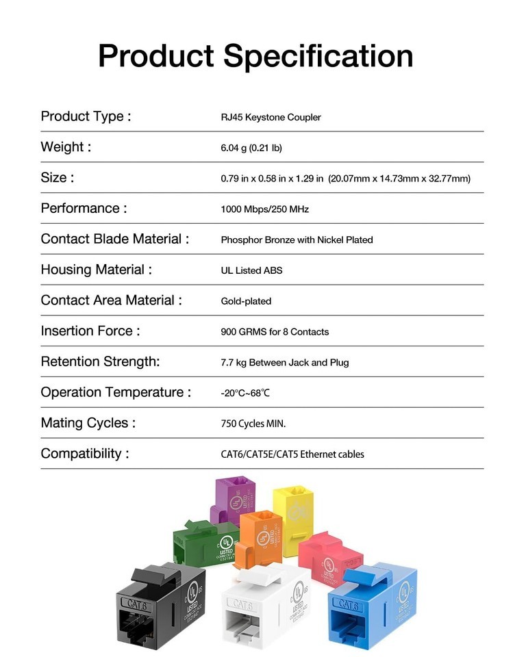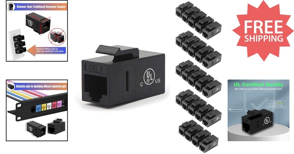 Upgrade your networking setup with our VCE CAT6 Female to Female Keystone Coupler. Designed to seamlessly connect two CAT6 Ethernet cables, this coupler features gold-plated contacts and an easy snap-in retaining clip for a secure, corrosion-free connection. Compatible with all standard keystone wall plates and patch panels, it?s perfect for voice, home networking, office, audio, and video applications. Each package includes 25 high-quality RJ45 Keystone Couplers, backed by an 18- and Listing (E521847) for added peace of mind. Simplify your network connections with reliability and ease.